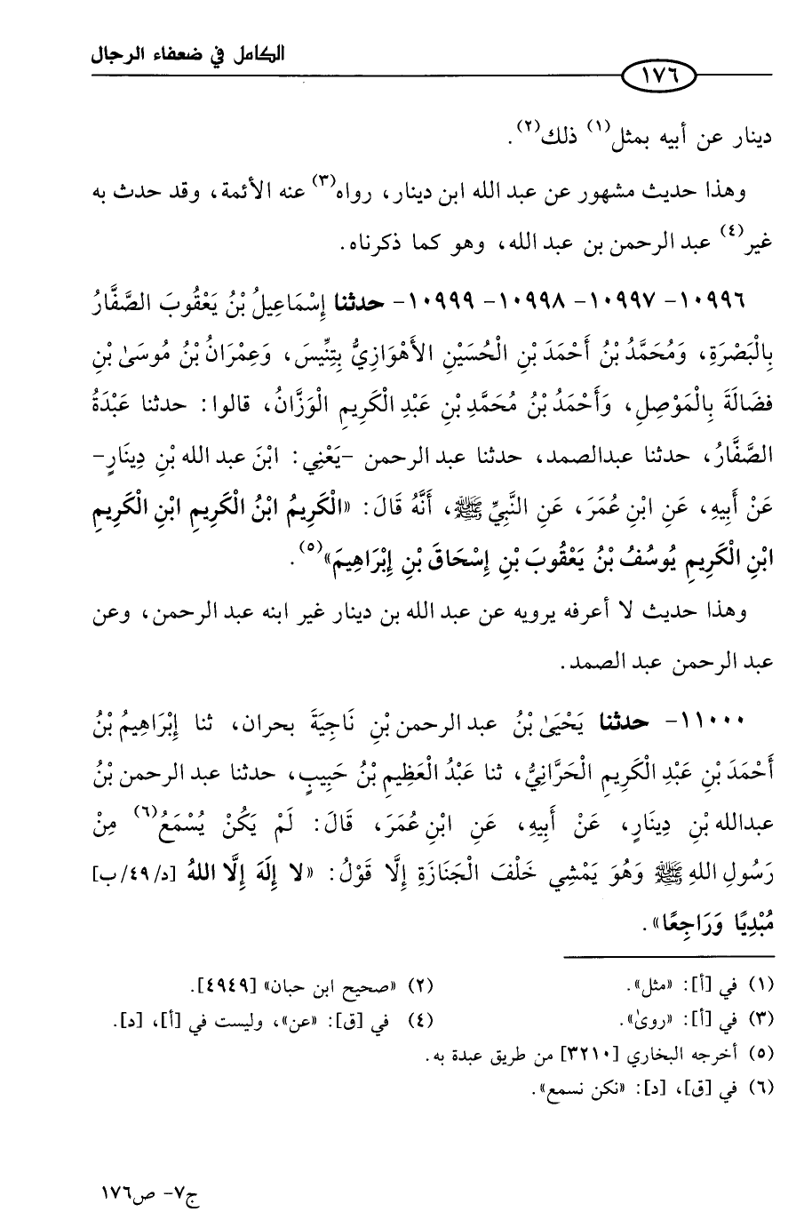 10996 - 10997 - 10998 - 10999 - حَدثنا إسماعيل بن يعقوب الصفار بالبصرة، ومُحمد بن أحمد بن الحسين الأهوازي بتنيس، وعمران بن موسي بن فضالة بالموصل، وأحمد بن مُحمد بن عَبد الكريم الوزان، قالوا: حَدثنا عبدة الصفار، حَدثنا عَبد الصمد، حَدثنا عَبد الرحمن، يَعني ابن عَبد الله بن دينار، عن أبيه، عن ابن عُمر، عن النبي صَلي الله عَليه وسلم أنه قال: الكريم ابن الكريم ابن الكريم ابن الكريم يوسف بن يعقوب بن إسحاق بن إبراهيم.