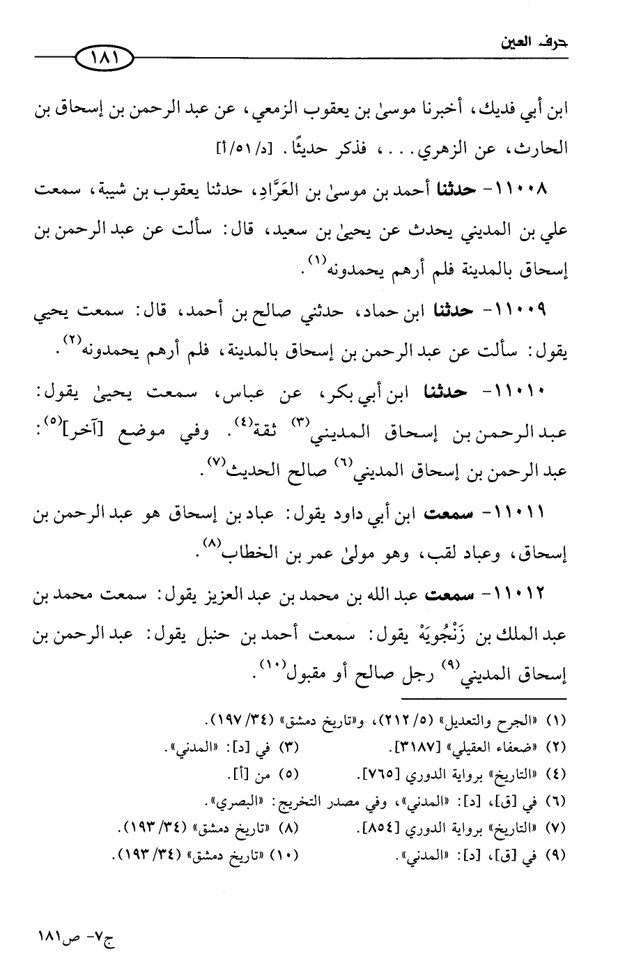11008 - حَدثنا أحمد بن موسي بن العراد، حَدثنا يعقوب بن شيبة، سمعت علي بن المديني، يحدث عن يَحيي بن سعيد، قال: سَألتُ عن عَبد الرحمن بن إسحاق بالمدينة، فلم أرهم يحمدونه.