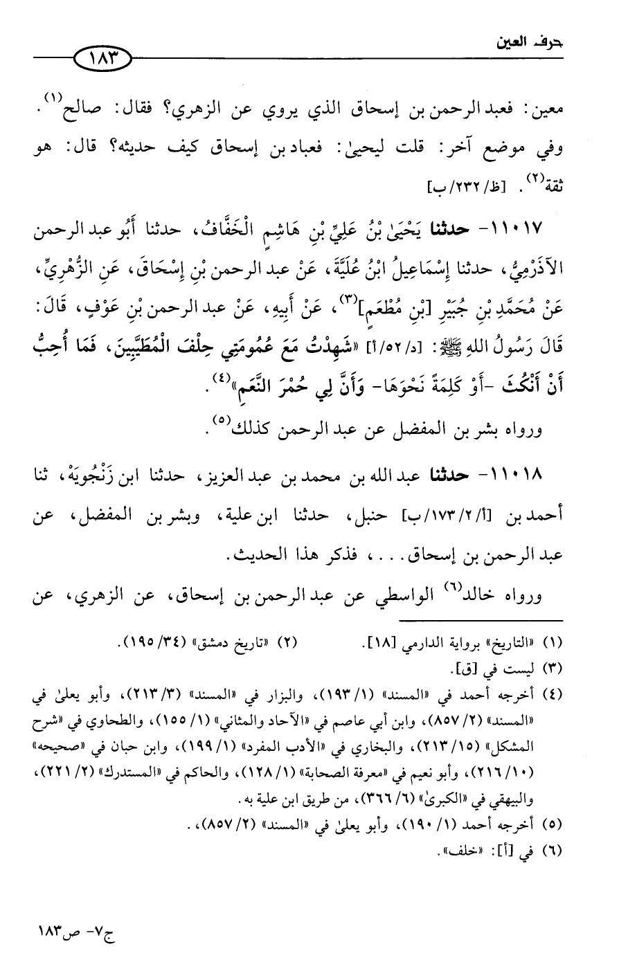 11018 - حَدثنا عَبد الله بن مُحمد بن عَبد العزيز، حَدثنا ابن زنجَوَيهِ، حَدثنا أحمد بن حنبل، حَدثنا ابن علية، وبشر بن المفضل، عن عَبد الرحمن بن إسحاق، فذكر هذا الحديث.