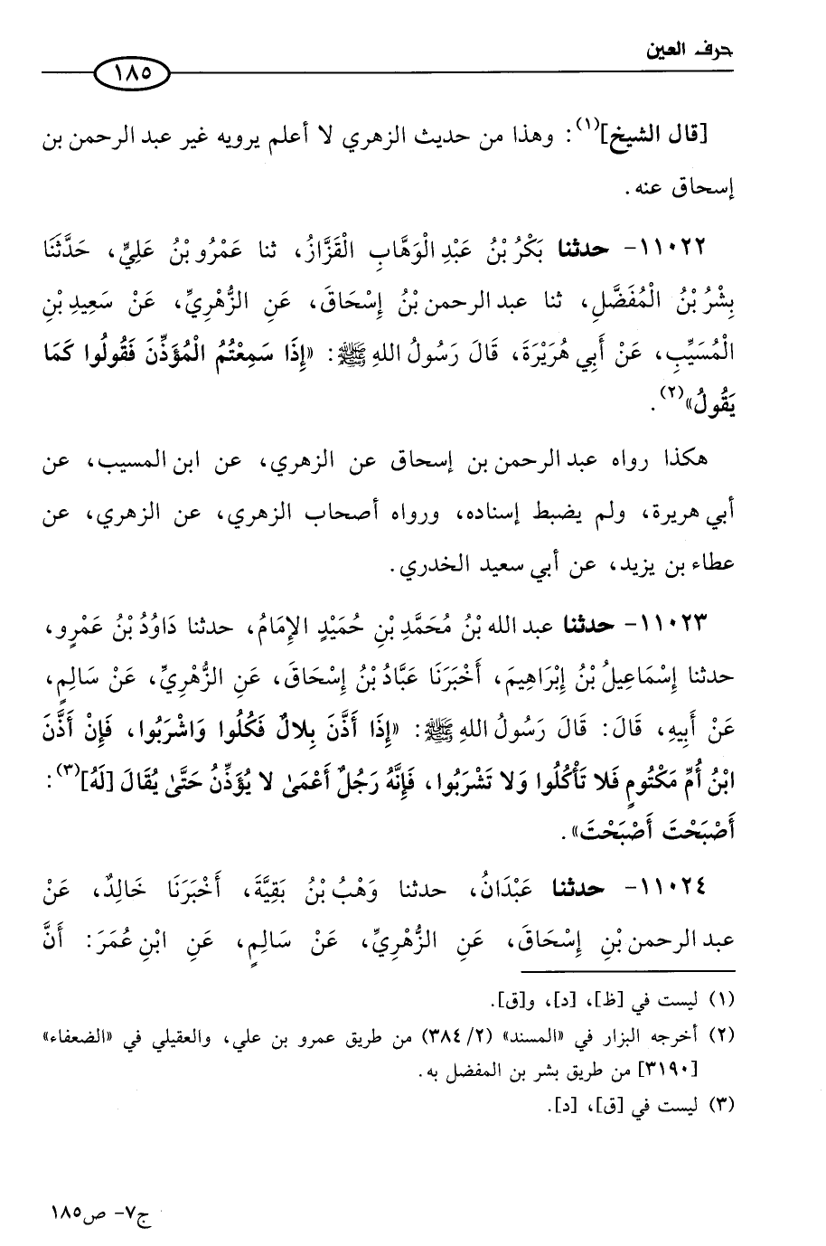 11022 - حَدثنا بكر بن عَبد الوهاب القزاز، حَدثنا عَمرو بن علي، حَدثنا بشر بن المفضل، حَدثنا عَبد الرحمن بن إسحاق، عن الزُّهْري، عن سعيد بن المُسَيَّب، عن أبي هريرة، قال رسول الله صَلي الله عَليه وسلم: إذا سمعتم المؤذن فقولوا كما يقول.
