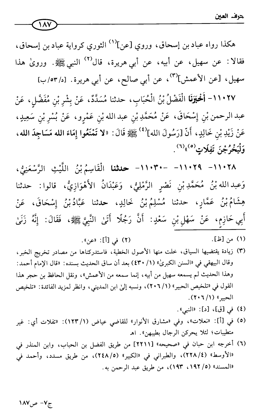 11028 - 11029 - 11030 - حَدثنا القاسم بن الليث الرسعني، وعَبد الله بن مُحمد بن نصر الرملي، وعبدان الأهوازي، قالوا: حَدثنا هشام بن عمار، حَدثنا مسلم بن خالد، حَدثنا عباد بن إسحاق، عن أبي حازم، عن سهل بن سعد؛ أَنّ رجلاً أتي النبي صَلي الله عَليه وسلم فقال: إنه زني بفلانة، امرأة قد سماها، فبعث النبي صَلي الله عَليه وسلم إلي المرأة فسألها فانكرت، فرجمه.