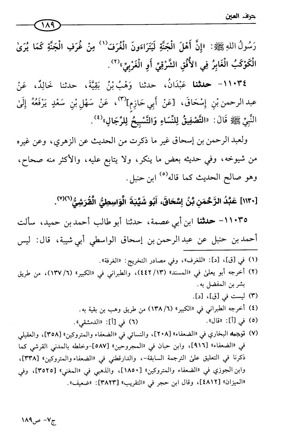 11034 - حَدثنا عبدان، حَدثنا وهب بن بقية، حَدثنا خالد، عن عَبد الرحمن بن إسحاق، عن أبي حازم، عن سهل بن سعد، يرفعه إلي النبي صَلي الله عَليه وسَلم قال: التصفيق للنساء، والتسبيح للرجال.
