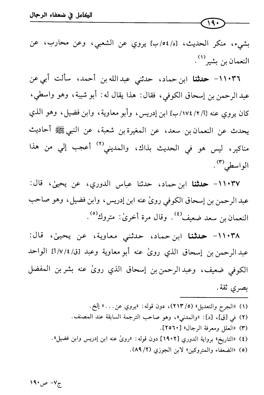 11037 - حَدثنا ابن حماد، حَدثنا عباس الدوري، عن يَحيي، قال: عَبد الرحمن بن إسحاق الكوفي روي عنه ابن إدريس وابن فضيل، وهو صاحب النعمان بن سعد ضعيف، وقال مرة أخري: متروك.