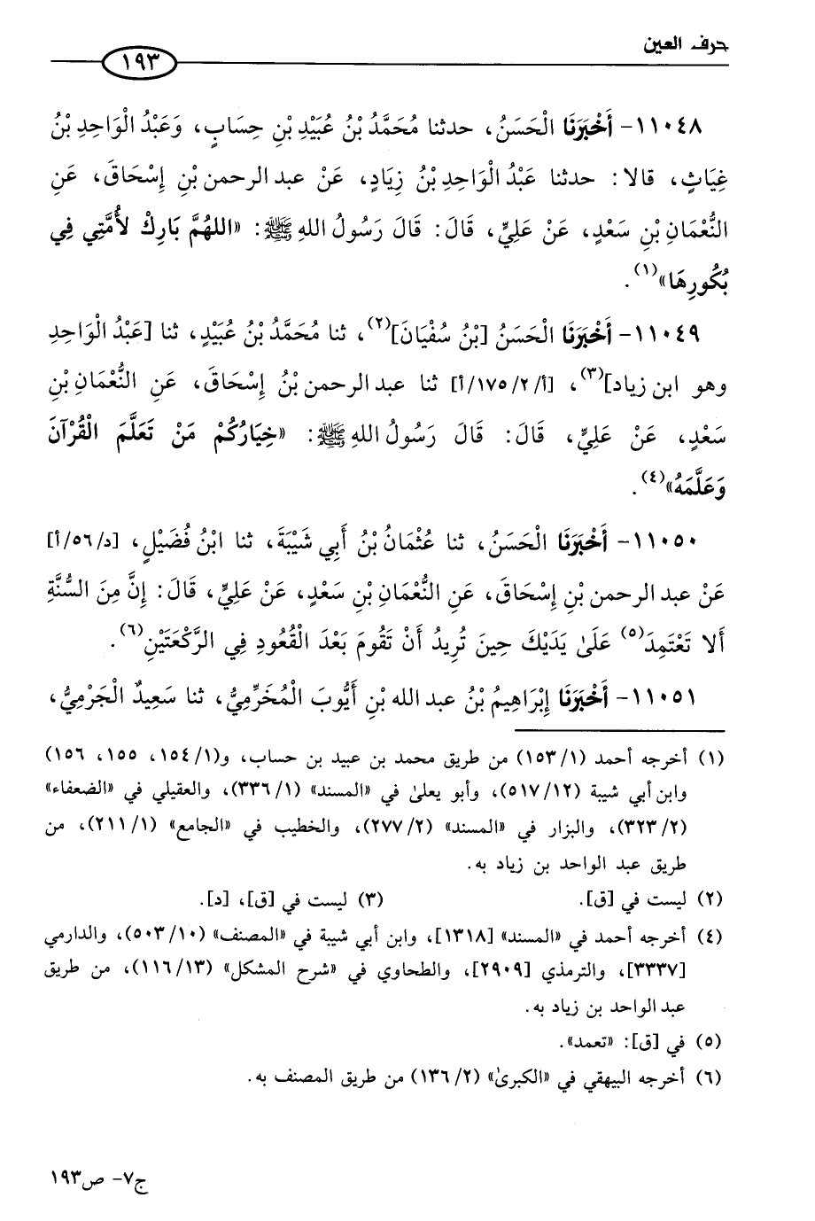 11049 - أخبرنا الحسن بن سفيان، حَدثنا مُحمد بن عُبيد، حَدَّثنا عَبد الواحد، وهو ابن زياد، حَدثنا عَبد الرحمن بن إسحاق، عن النعمان بن سعد، عن علي، قال: قال رسول الله صَلي الله عَليه وسَلم: خياركم من تعلم القرآن وعلمه.