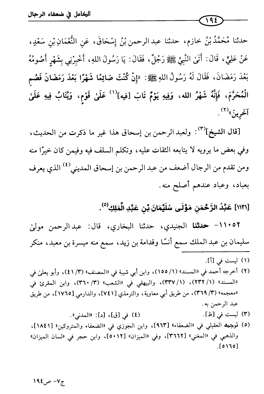 11052 - حَدثنا الجنيدي، حَدثنا البُخاري قال: عَبد الرحمن مولي سليمان بن عَبد الملك سمع أنسا وقدامة بن زيد، سمع منه ميسرة بن معبد، منكر الحديث.