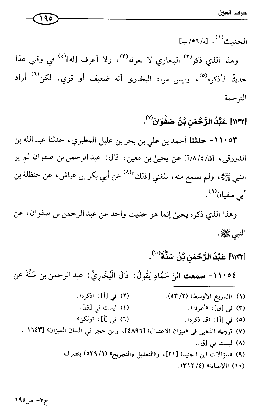 11053 - حَدثنا أحمد بن علي بن بحر بن عليل المطيري، حَدثنا عَبد الله بن الدورقي، عن يَحيي بن مَعين قال: عَبد الرحمن بن صفوان لم ير النبي صَلي الله عَليه وسلم ولم يسمع منه، بلغني ذلك عن أبي بكر بن عياش، عن حنظلة بن أبي سفيان.