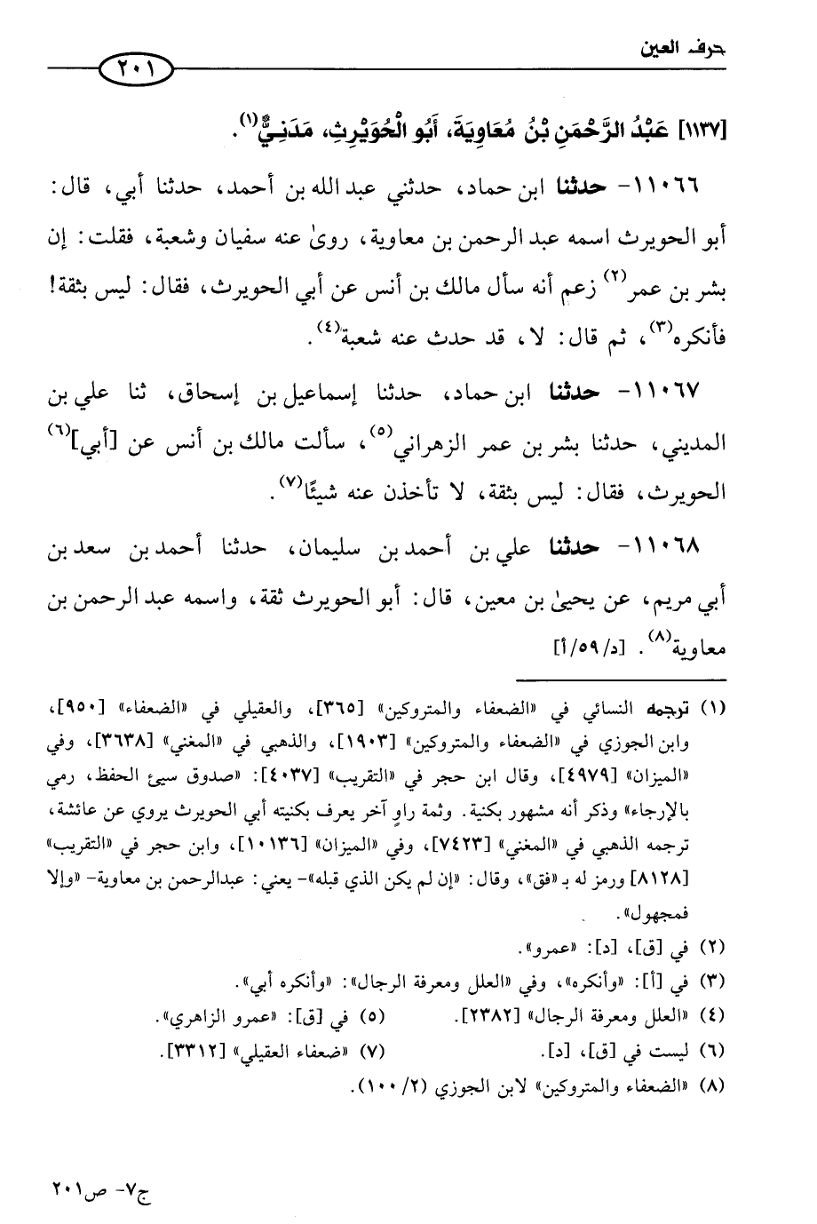 11067 - حَدثنا ابن حماد، حَدثنا إسماعيل بن إسحاق، حَدثنا علي بن المديني، حَدثنا بشر بن عُمر الزهراني سألت مالك بن أنس، عن أبي الحويرث، فقال: ليس بثقة، لا تأخذن عنه شَيئًا.
