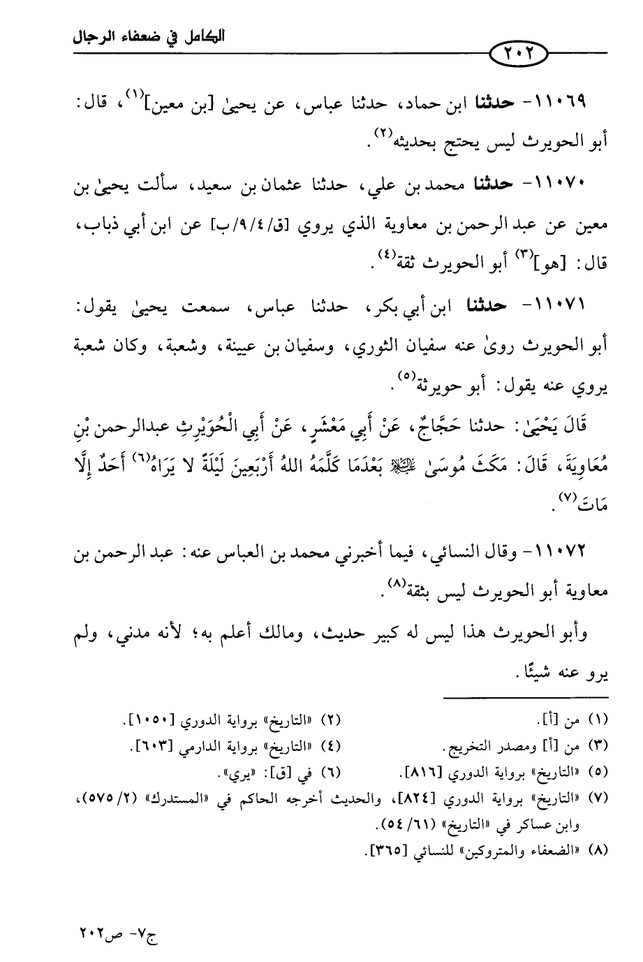 11071 - حَدثنا ابن أبي بكر، حَدثنا عباس، سمعتُ يَحيَي يقول: أَبو الحُوَيرِث روي عنه سُفْيان الثَّوري وسُفْيان بن عُيَينَة وشُعبَة, وكان شُعبَة يروي عنه يقول: أَبو حُوَيرِثة.