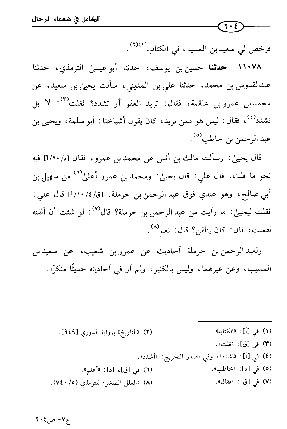 11078 - حَدثنا حسين بن يوسف، حَدثنا أَبو عيسي التِّرمِذِي، حَدثنا عَبد القدوس بن مُحمد، حَدثنا علي بن المديني، سألت يَحيي بن سعيد، عن مُحمد بن عَمرو بن علقمة، فقال: تريد العفو أو تشدد؟ فقلت: لا، بل تشدد، فقال: ليس هو ممن تريد، كان يقول: أشياخنا أَبو سلمة ويحيي بن عَبد الرحمن بن حاطب. قال يَحيي: وسألت مالك بن أنس، عن مُحمد بن عَمرو، فقال فيه نحو ما قلت. قال علي: قال يَحيي: ومُحمد بن عَمرو أعلي من سهيل بن أبي صالح، وهو عندي فوق عَبد الرحمن بن حرملة، قال علي: فقلت ليحيي: ما رأيت من عَبد الرحمن بن حرملة؟ قال: لو شئت أن ألقنه لفعلت، قال: كان يتلقن؟ قال: نَعم.