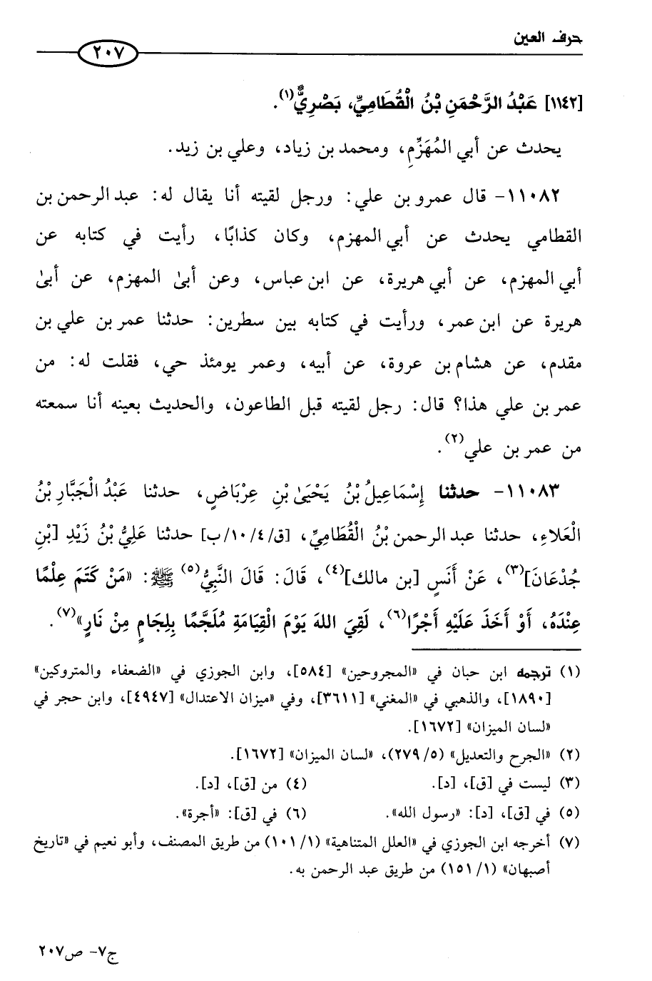 11082 - قال عَمرو بن علي: ورجل لقيته أنا يُقال له: عَبد الرحمن بن القطامي، يحدث عن أبي المهزم، وكان كذَّابًا، رأيت في كتابه: عن أبي المهزم، عن أبي هريرة، عن ابن عباس. وعن أبي المهزم، عن أبي هريرة، عن ابن عُمر، ورأيت في كتابه بين سطرين: حَدثنا عُمر بن علي بن مقدم، عن هشام بن عروة، عن أبيه، وعمر يومئذ حي، فقلت له: مَن عُمر بن علي هذا؟ قال: رجل لقيته قبل الطاعون، والحديث بعينه أنا سمعته من عمر بن علي.