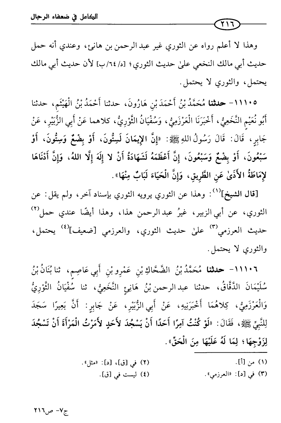 11105 - حَدثنا مُحمد بن أحمد بن هارون، حَدثنا أحمد بن الهيثم، حَدثنا أَبو نعيم النخعي، أخبرنا العرزمي وسفيان الثَّوري، كلاهما عن أبي الزبير، عن جابر، قال: قال رسول الله صَلي الله عَليه وسَلم: إن الإيمان لستون، أو بضع وستون، أو سبعون، أو بضع وسبعون، إن أعظمه لشهادة أن لا إله إلا الله، وإن أدناها لإماطة الأذي عن الطريق، وإن الحياء لباب منها.