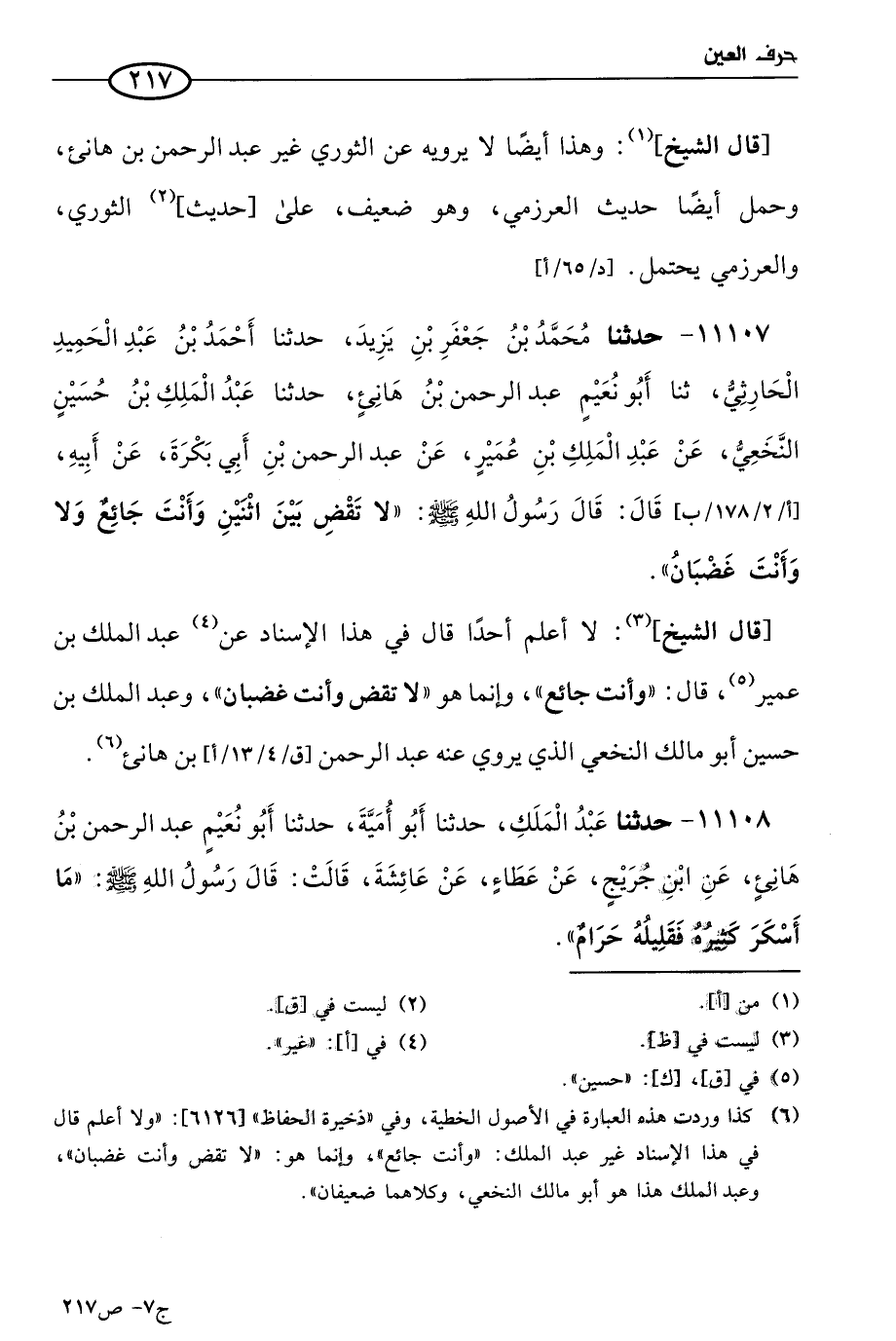 11107 - حَدثنا مُحمد بن جعفر بن يزيد، حَدثنا أحمد بن عَبد الحميد الحارثي، حَدثنا أَبو نعيم عَبد الرحمن بن هانئ، حَدثنا عَبد الملك بن حسين النخعي، عن عَبد الملك بن عُمَير، عن عَبد الرحمن بن أبي بكرة، عن أبيه، قال: قال رسول الله صَلي الله عَليه وسَلم: لا تقض بين اثنين وأنت جائع، ولا وأنت غضبان.