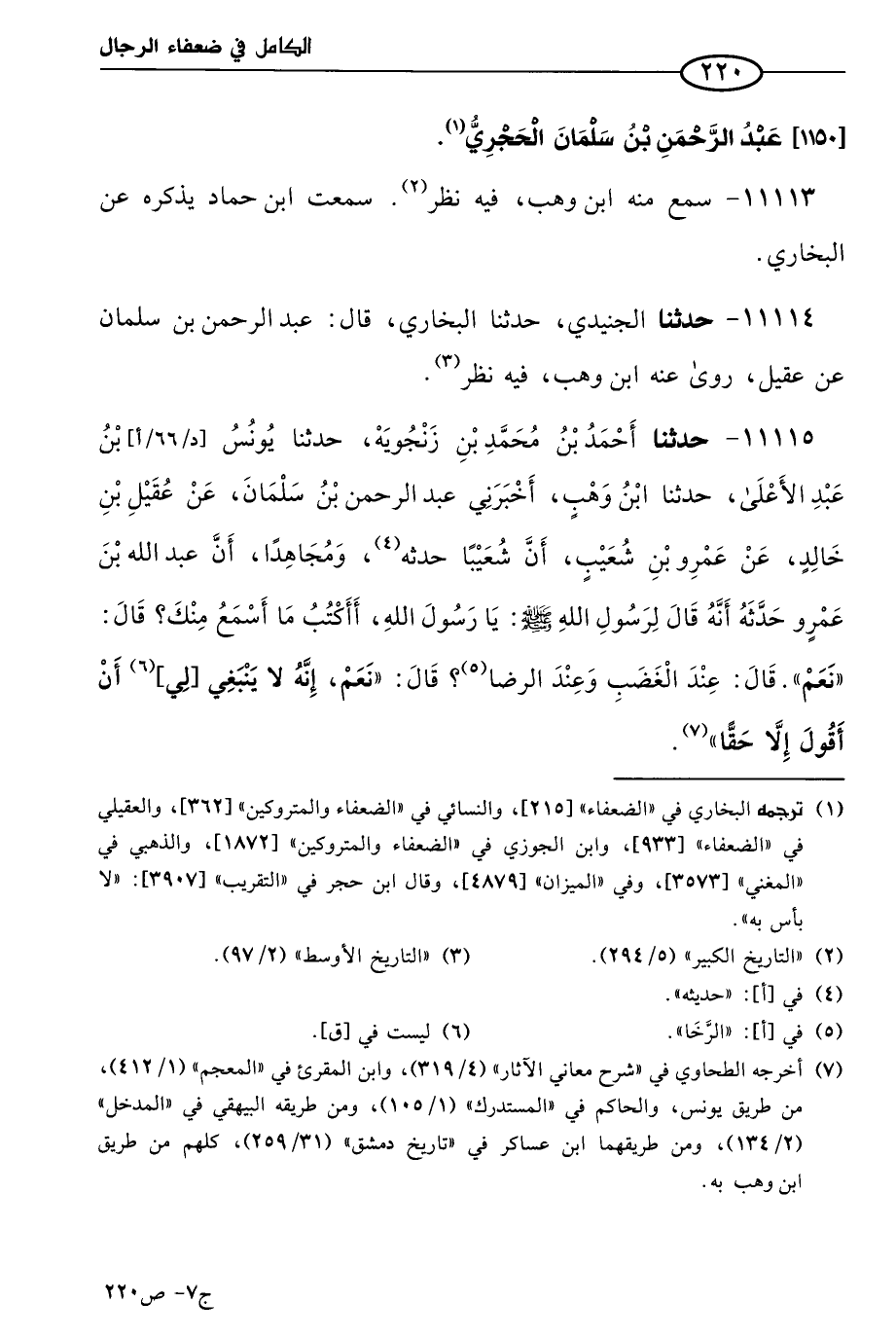 11114 - حَدثنا الجنيدي، حَدثنا البُخاري قال: عَبد الرحمن بن سلمان عن عُقَيل، روي عنه ابن وهب، فيه نظر.