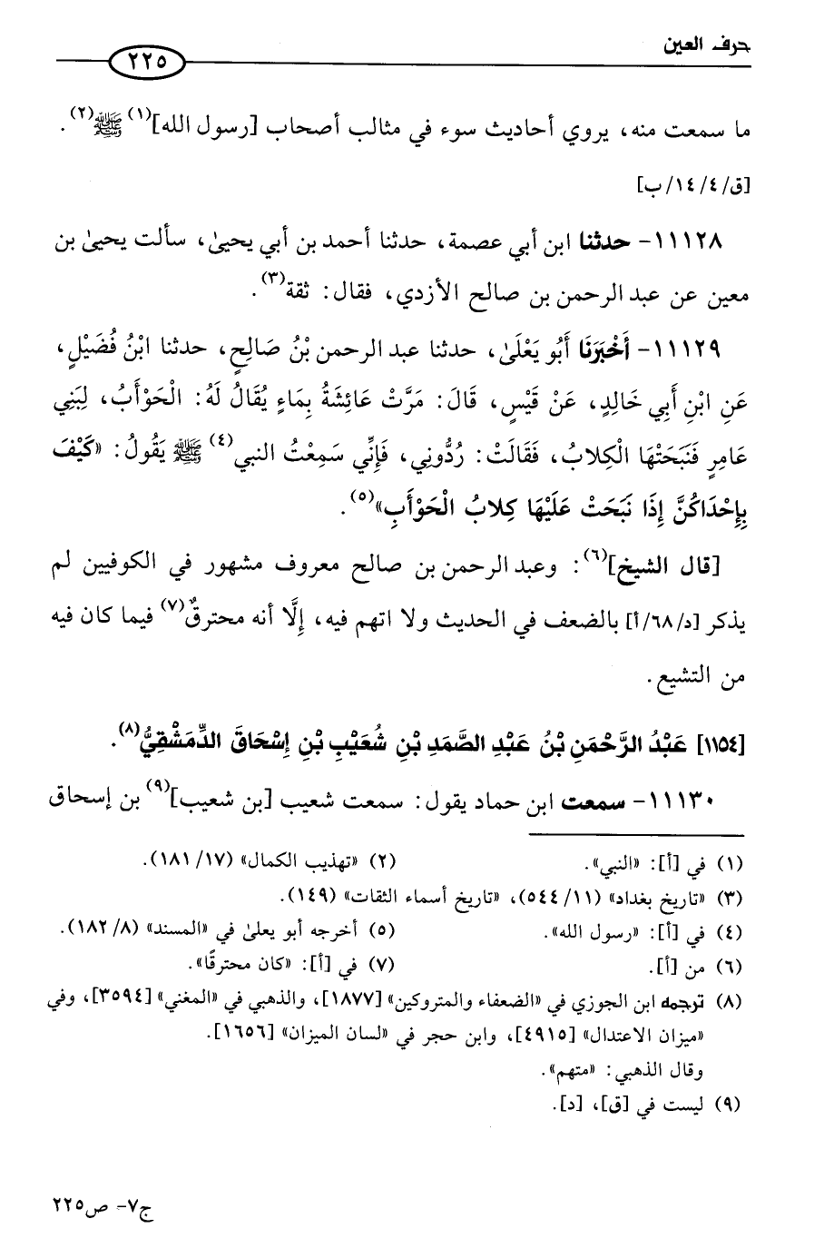 قال الشيخ: وعَبد الرحمن بن صالح معروف مشهور في الكوفيين، لم يذكر بالضعف في الحديث، ولا اتهم فيه، إلا أنه محترق فيما كان فيه من التشيع.