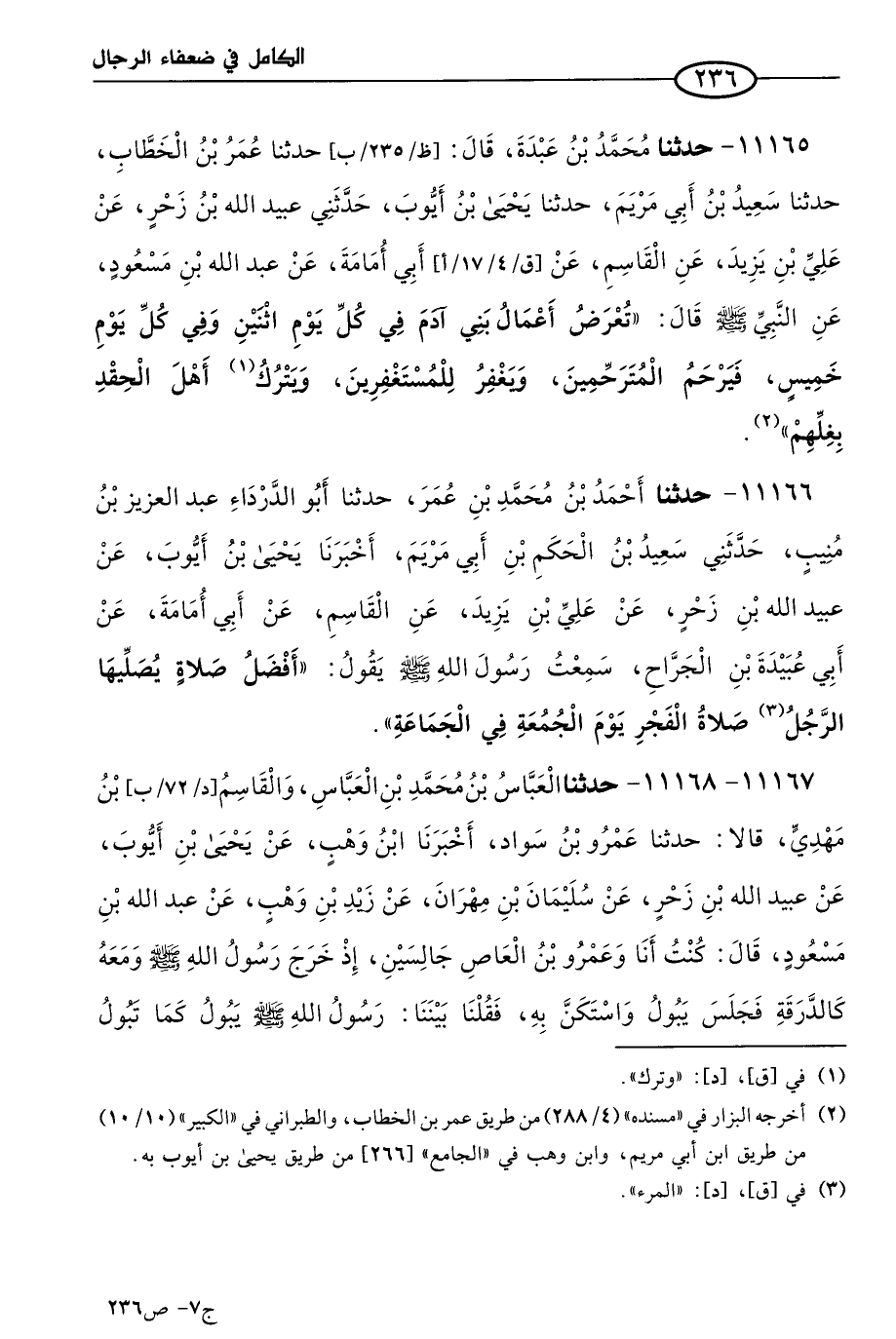 11165 - حَدثنا مُحمد بن عبدة، قال: حَدثنا عُمر بن الخطاب، حَدثنا سعيد بن أبي مريم، حَدثنا يَحيى بن أيوب، حَدَّثني عُبيد الله بن زحر، عن علي بن يزيد، عن القاسم، عن أَبي أُمامة، عن عَبد الله بن مسعود، عن النبي صَلى الله عَليه وسَلم قال: تعرض أعمال بني آدم في كل يوم اثنين، وفي كل يوم خميس، فيرحم المترحمين، ويغفر للمستغفرين، ويترك أهل الحقد بغلهم.