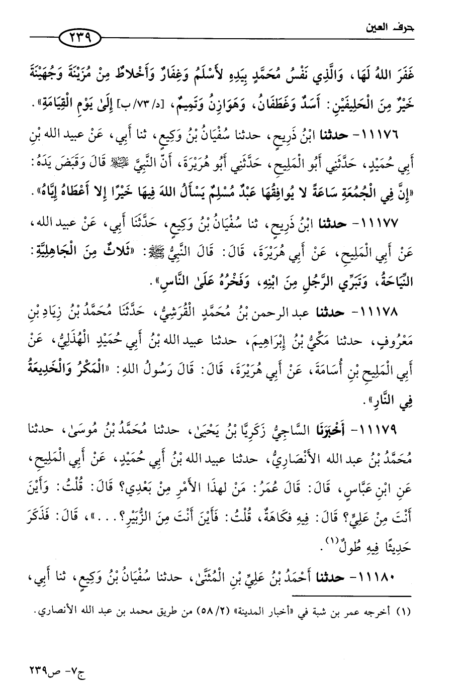 11176 - حَدثنا ابن ذريح، حَدثنا سفيان بن وكيع، حَدثنا أبي، عن عُبيد الله بن أبي حميد، حَدَّثني أَبو المليح، حَدَّثني أَبو هريرة، أن النبي عليه السلام قال، وقبض يده: إن في الجمعة ساعة، لا يوافقها عَبد مسلم يسأل الله فيها خيرًا إلا أعطاه إياه.