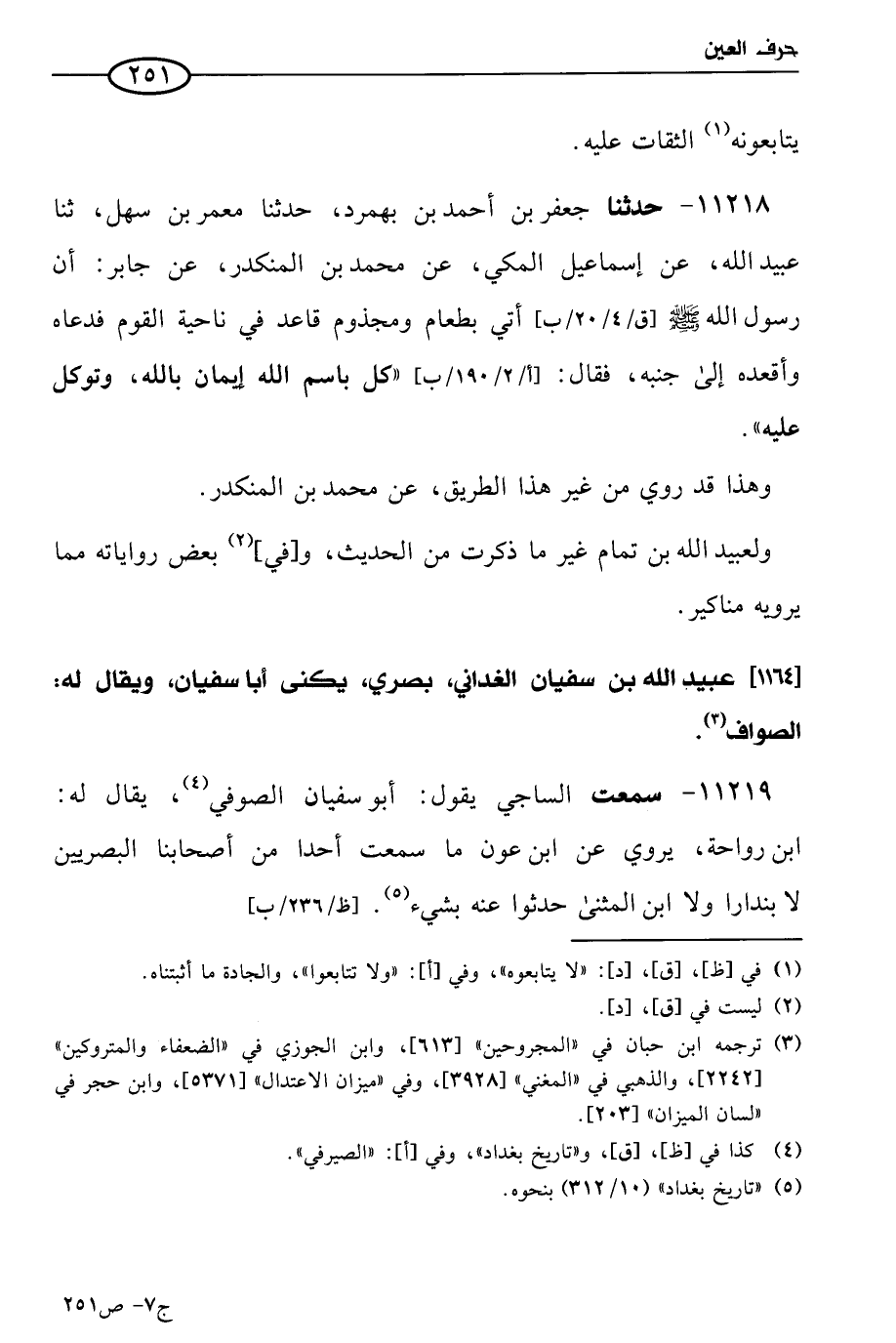 11218 - حَدثنا جعفر بن أحمد بن بهمرد، حَدثنا معمر بن سهل، حَدثنا عُبيد الله، عن إسماعيل المكي، عن مُحمد بن المنكدر، عن جابر؛ أَن رسُول الله صَلى الله عَليه وسلم أتي بطعام، ومجذوم قاعد في ناحية القوم، فدعاه وأقعده إلى جنبه، فقال: كل باسم الله، إيمان بالله، وتوكل عليه.