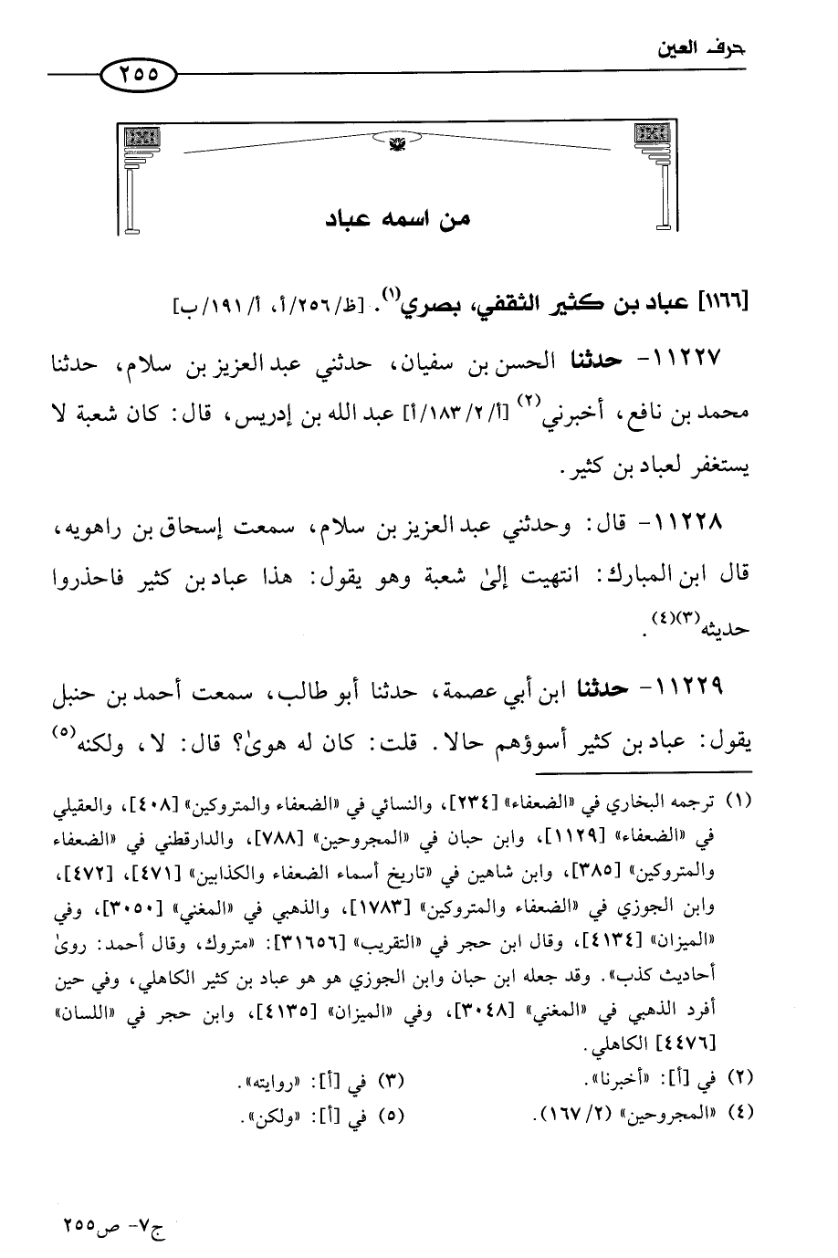 11227 - حَدثنا الحسن بن سفيان، حَدَّثني عَبد العزيز بن سلام، حَدثنا مُحمد بن نافع، أخبرني عَبد الله بن إدريس، قال: كان شُعبَة لا يستغفر لعباد بن كثير.