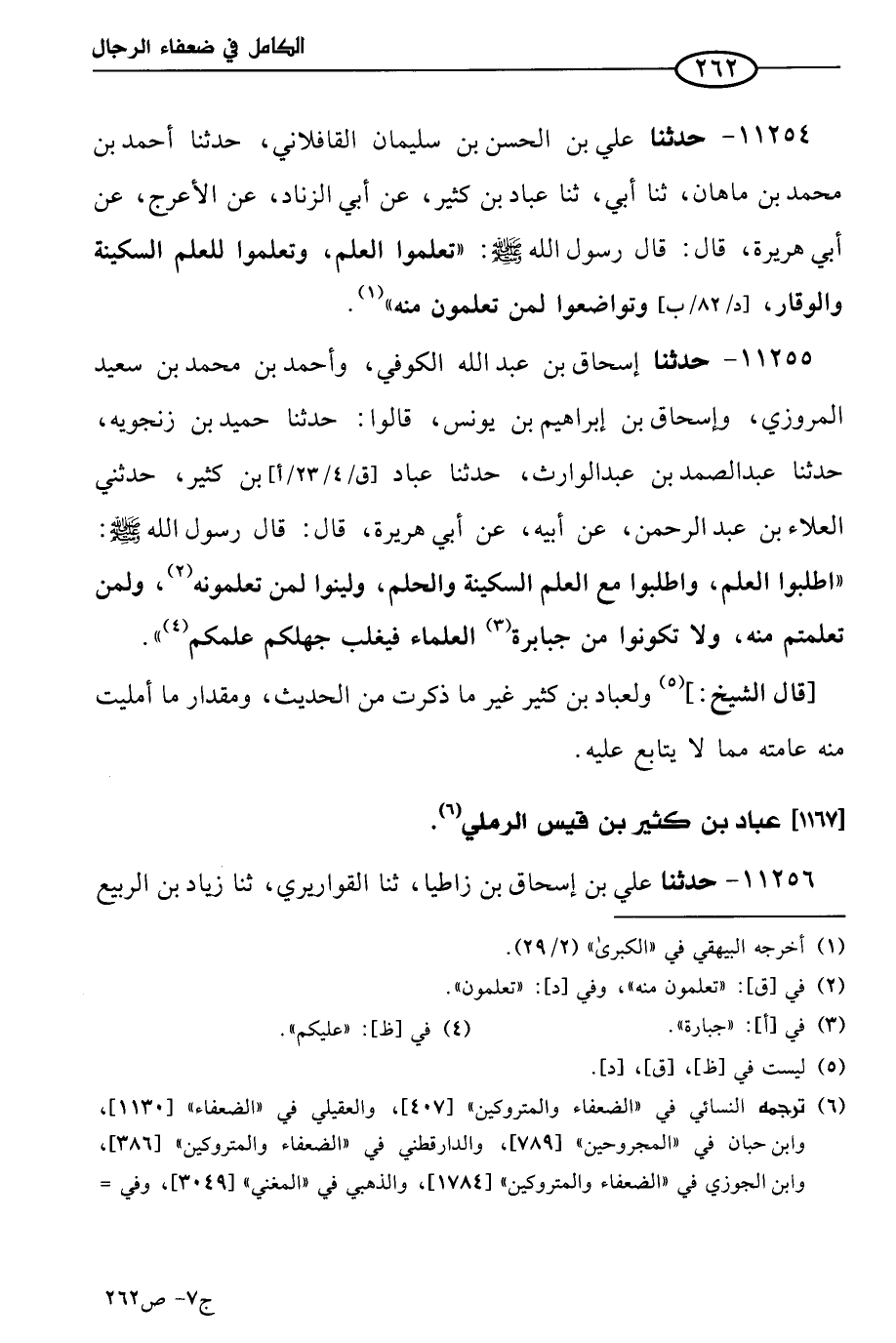 11255 - حَدثنا إسحاق بن عَبد الله الكوفي، وأحمد بن مُحمد بن سعيد المروزي، وإسحاق بن إبراهيم بن يُونُس، قالوا: حَدثنا حميد بن زنجَوَيهِ، حَدثنا عَبد الصمد بن عَبد الوارث، حَدثنا عباد بن كثير، حَدَّثني العلاء بن عَبد الرحمن، عن أبيه، عن أبي هريرة، قال: قال رسول الله صَلى الله عَليه وسَلم: اطلبوا العلم، واطلبوا مع العلم السكينة والحلم، ولينوا لمن تُعَلِّمُونه، ولمن تعلمتم منه، ولا تكونوا من جبابرة العلماء، فيغلب جهلكم علمكم.