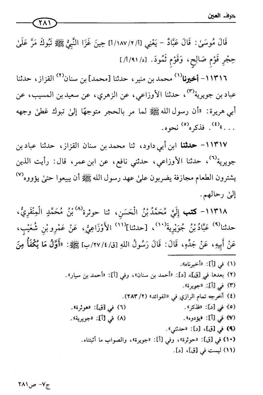 11316 - أخبرنا مُحمد بن منير، حَدثنا أحمد بن سنان القزاز، حَدثنا عباد بن جويرية، حَدثنا الأَوزاعي، عن الزُّهْري، عن سعيد بن المُسَيَّب، عن أبي هريرة؛ أن رسول الله صَلى الله عَليه وسَلم لما مر بالحجر متوجها إلى تبوك غطى وجهه، فذكر نحوه.