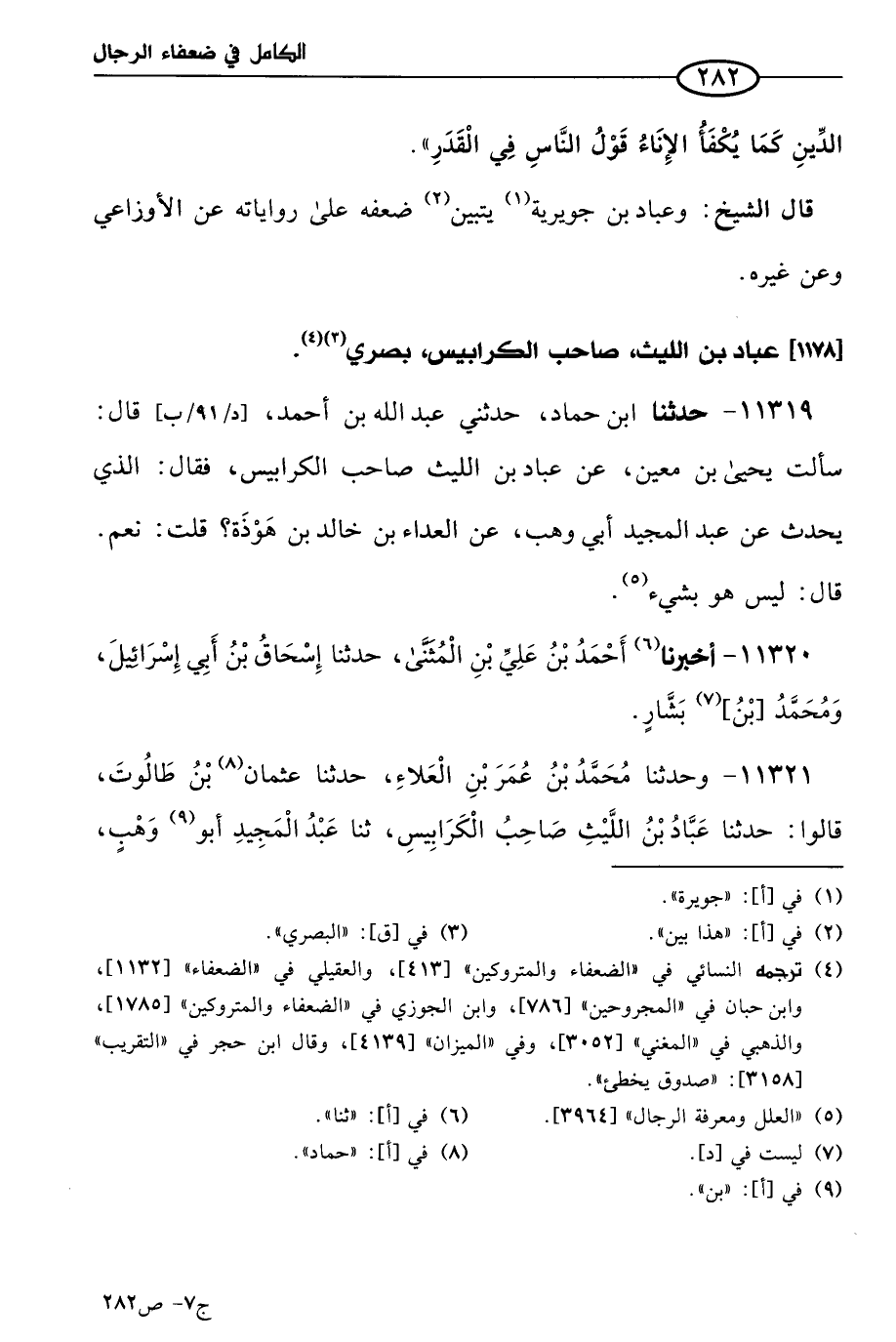 11319 - حَدثنا ابن حماد، حَدَّثني عَبد الله بن أحمد، قال: سَألتُ يَحيى بن مَعين، عن عباد بن الليث صاحب الكرابيس، فقال: الذي يحدث عن عَبد المجيد أبي وهب، عن العداء بن خالد بن هوذة؟ قلتُ: نَعَم، قال: ليس هو بشَيءٍ.