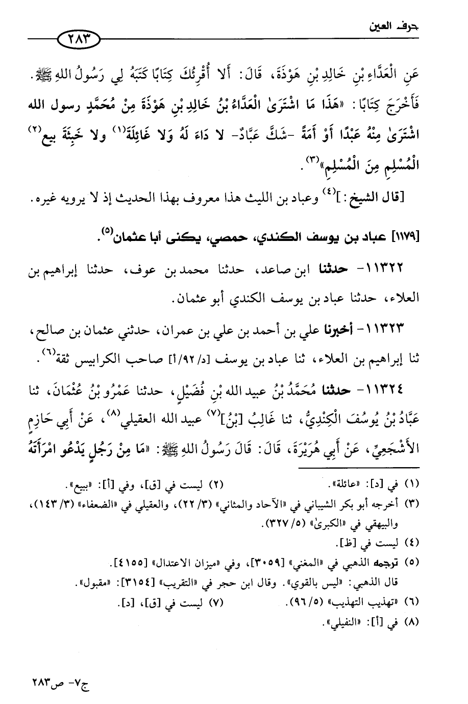 11323 - أخبرنا علي بن أحمد بن علي بن عمران، حَدَّثني عثمان بن صالح، حَدثنا إبراهيم بن العلاء، حَدثنا عباد بن يوسف الكندي صاحب الكرابيس ثقة.