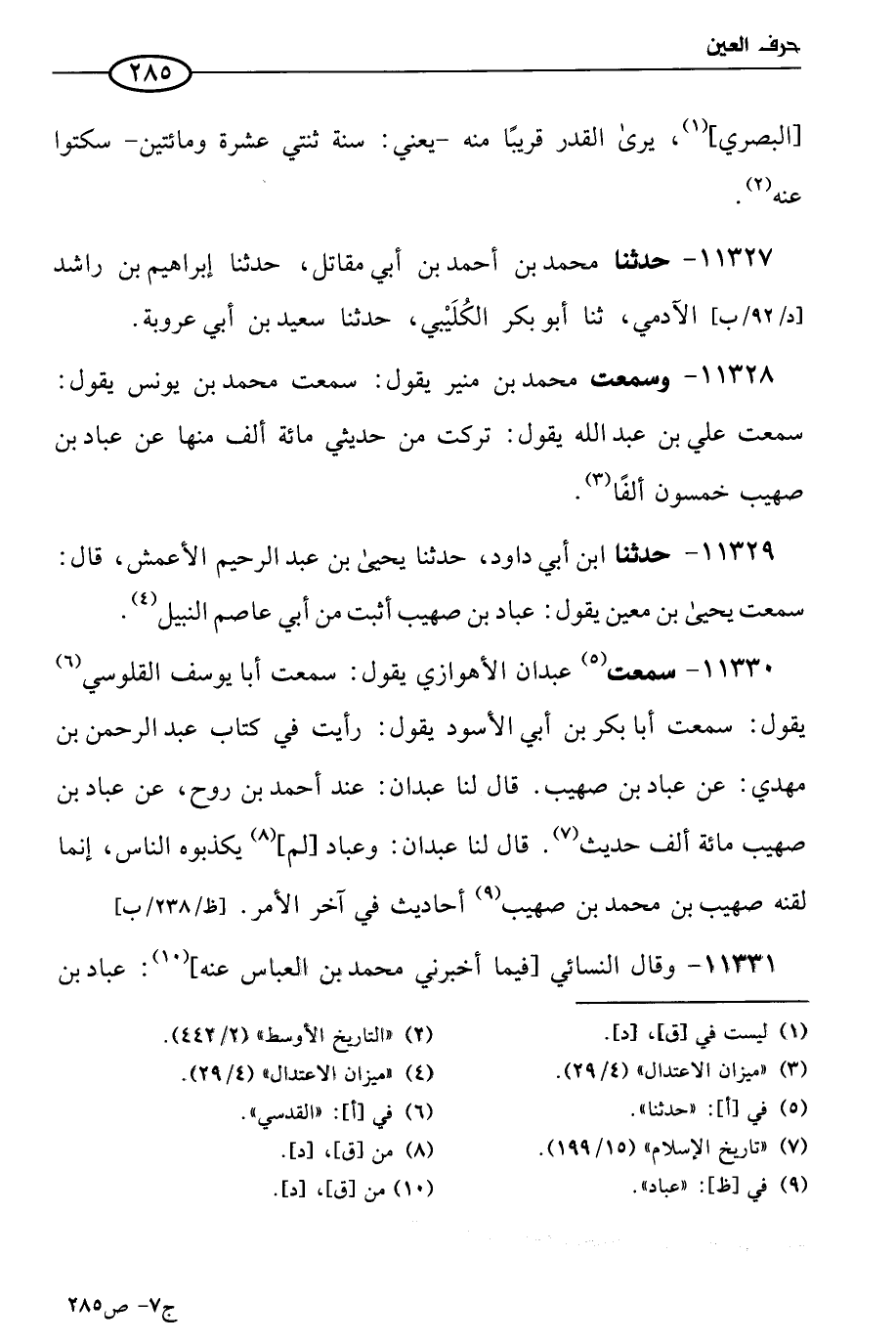 11330 - سمعت عبدان الأهوازي يقول: سَمعتُ أبا يوسف القلوسي يقول: سَمعتُ أبا بكر بن أبي الأسود يقول: رأيت في كتاب عَبد الرحمن بن مهدي عن عباد بن صهيب، قال لنا عبدان: عند أحمد بن روح، عن عباد بن صهيب مِئَة ألف حديث، قال لنا عبدان: وعباد لم يكذبوه الناس، إنما لقنه صهيب بن مُحمد بن صهيب أحاديث في آخر الأمر.