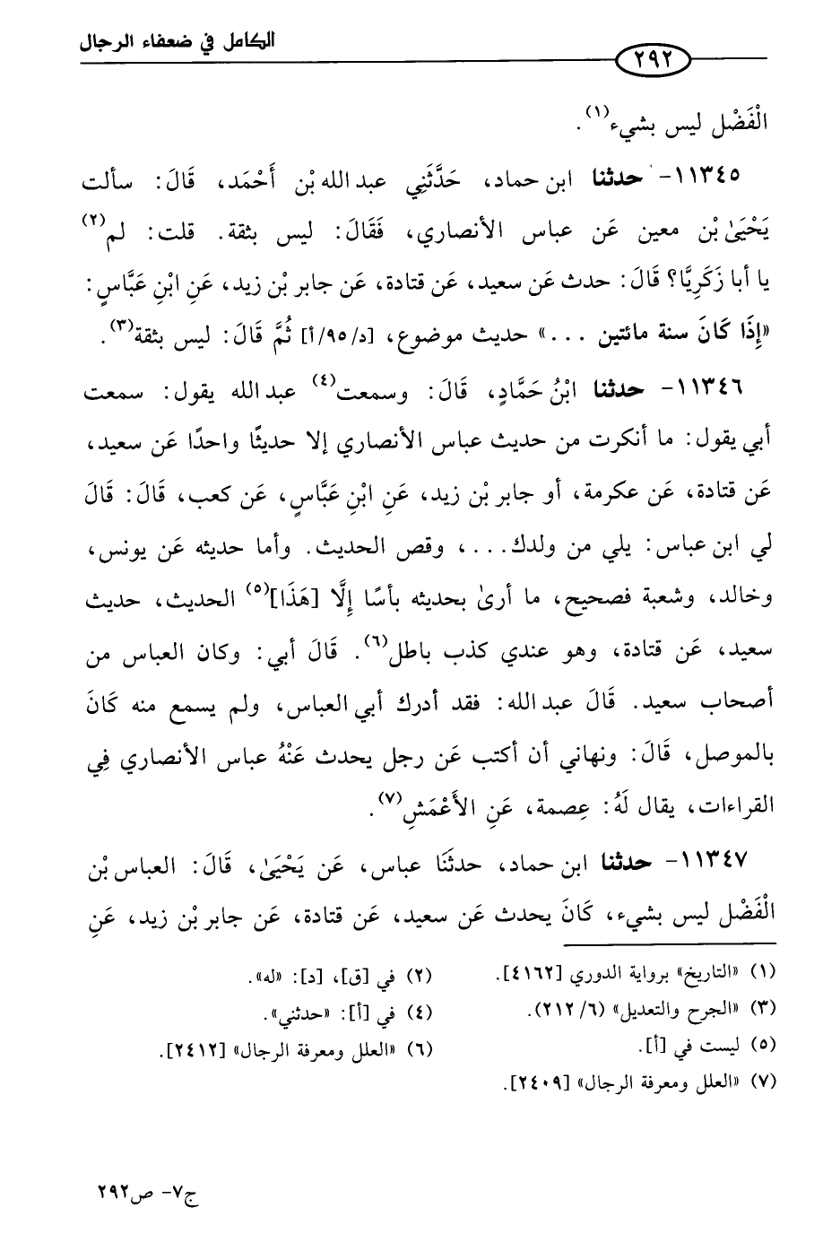 11347 - حَدثنا ابن حماد، حَدثنا عباس، عن يَحيى، قال: العباس بن الفضل ليس بشَيءٍ، كان يحدث عن سعيد عن قَتادَة عن جابر بن زيد، عن ابن عباس قال: إذا كان سنة كذا كان كذا، وهو حديث ليس له أصل.