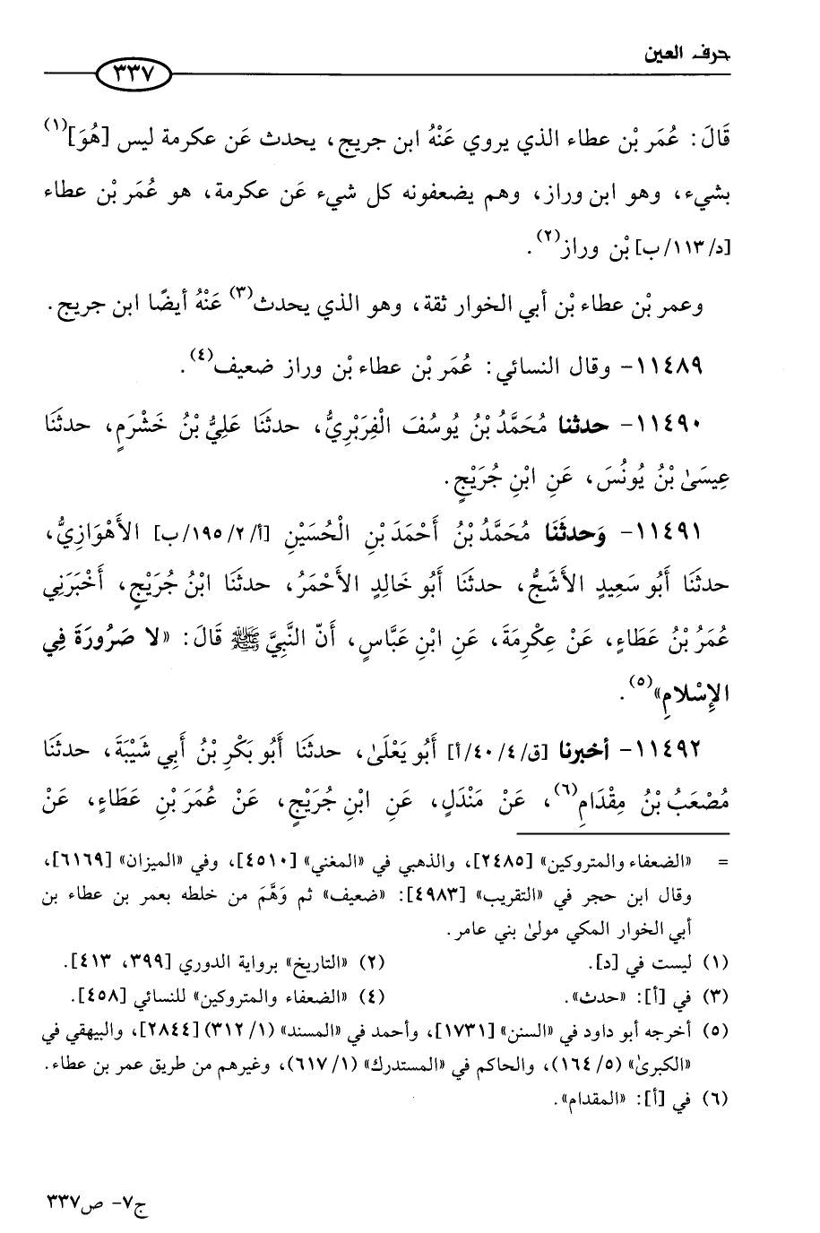 11491 - وحَدَّثنا مُحمد بن أحمد بن الحسين الأهوازي، حَدثنا أَبو سعيد الأَشَج، حَدثنا أَبو خالد الأحمر، حَدثنا ابن جُرَيج، أخبرني عُمر بن عطاء، عن عِكرمَة، عن ابن عباس؛ أن النبي صَلى الله عَليه وسَلم قال: لا صرورة في الإسلام.