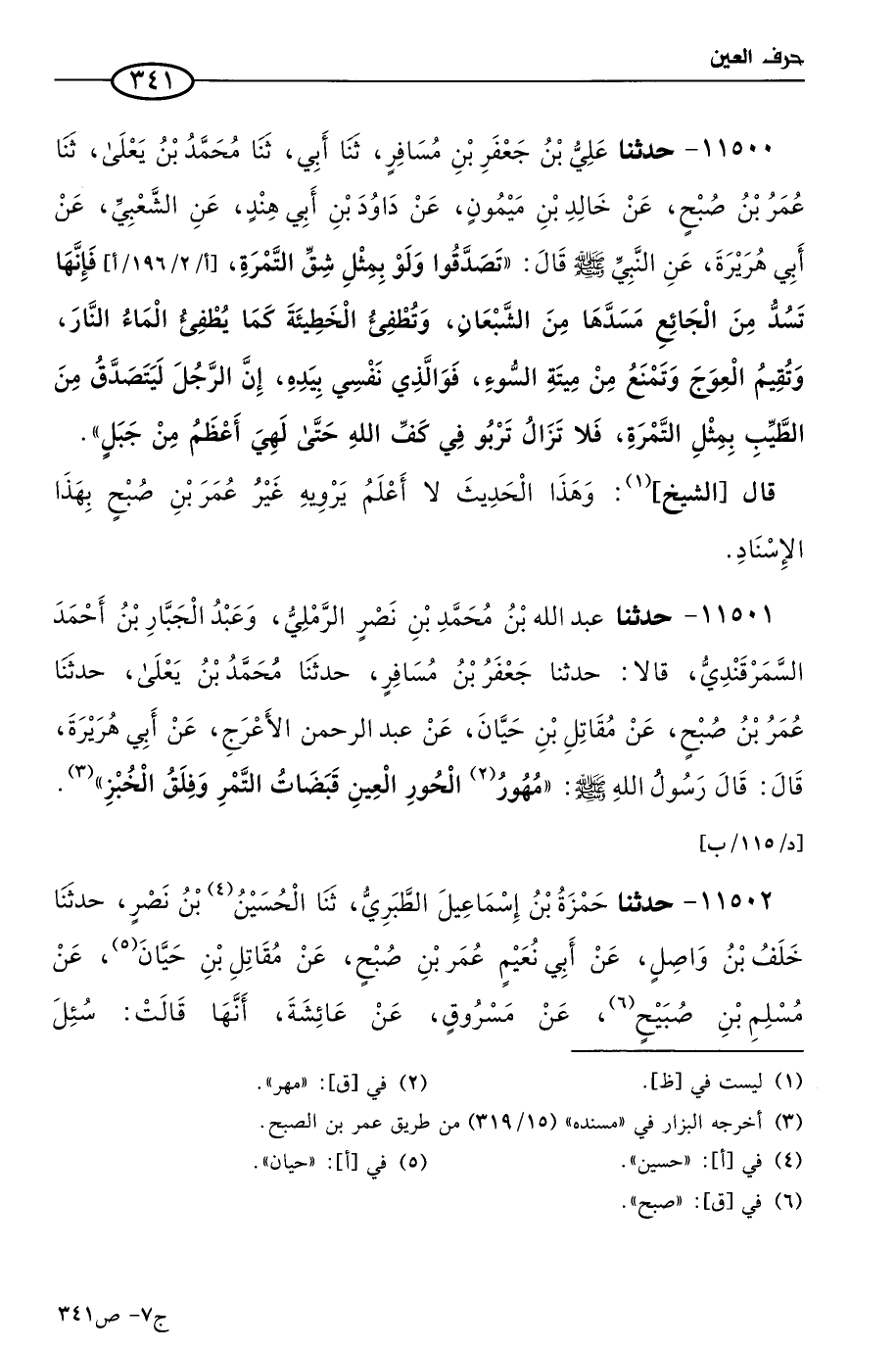 11500 - حَدثنا علي بن جعفر بن مسافر، حَدثنا أبي، حَدثنا مُحمد بن يعلى، حَدثنا عُمر بن صبح، عن خالد بن ميمون، عن داود بن أبي هند، عن الشعبي، عن أبي هريرة، عن النبي صَلى الله عَليه وسَلم قال: تصدقوا ولو بمثل شق التمرة، فإنها تسد من الجائع مسدها من الشبعان، وتطفىء الخطيئة كما يطفئ الماء النار، وتقيم العوج، وتمنع من ميتة السوء، فوالذي نفسي بيده إن الرجل ليتصدق من الطيب بمثل التمرة، فلا تزال تربو في كف الله حتى لهي أعظم من جبل.