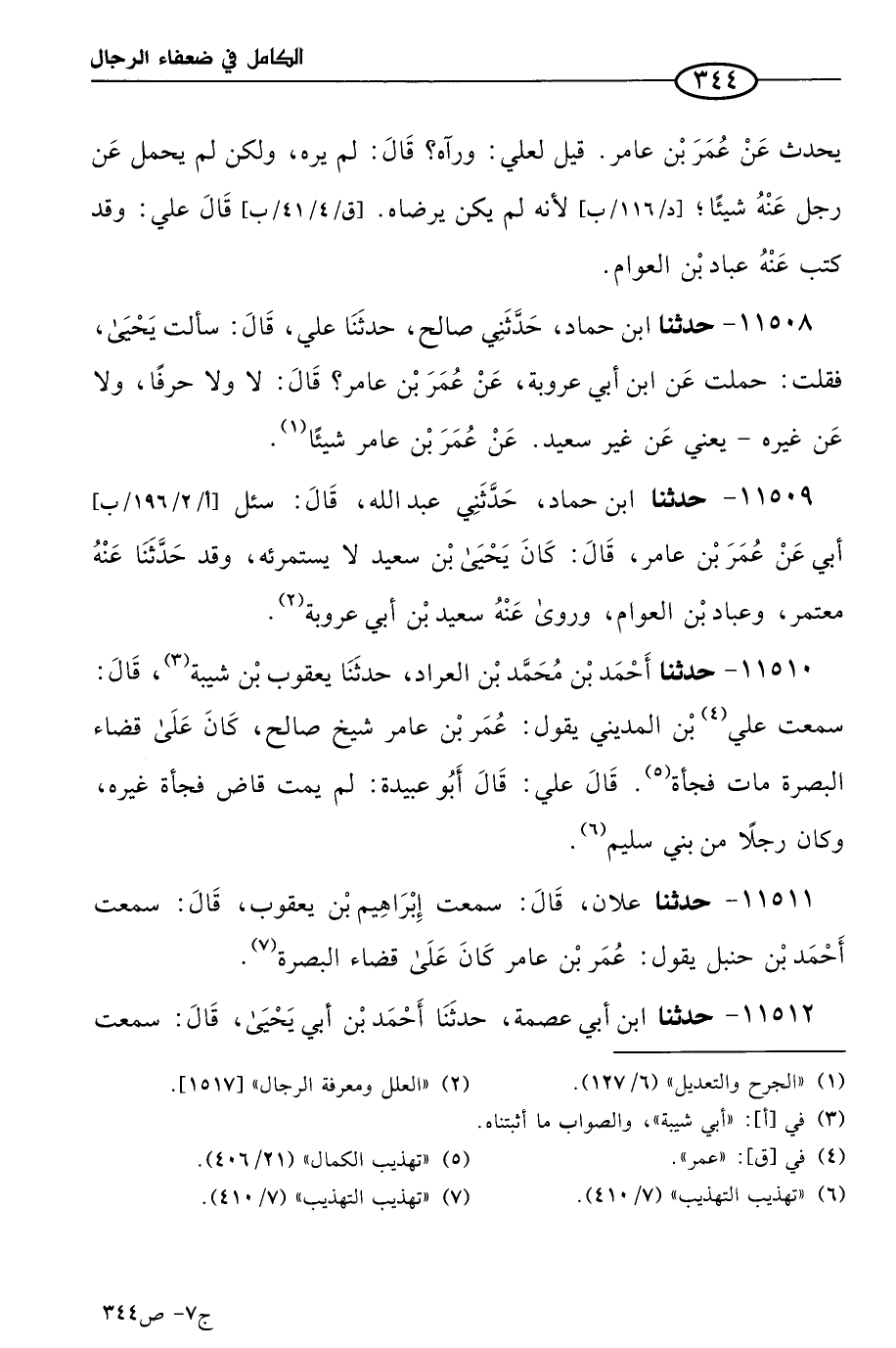 11510 - حَدثنا أحمد بن مُحمد بن العراد، حَدثنا يعقوب بن شيبة، قال: سمعتُ علي بن المديني يقول: عُمر بن عامر شيخ صالح، كان على قضاء البصرة مات فجأة، قال علي: قال أَبو عبيدة: لم يمت قاض فجأة غيره، وكان رجلاً من بني سليم.