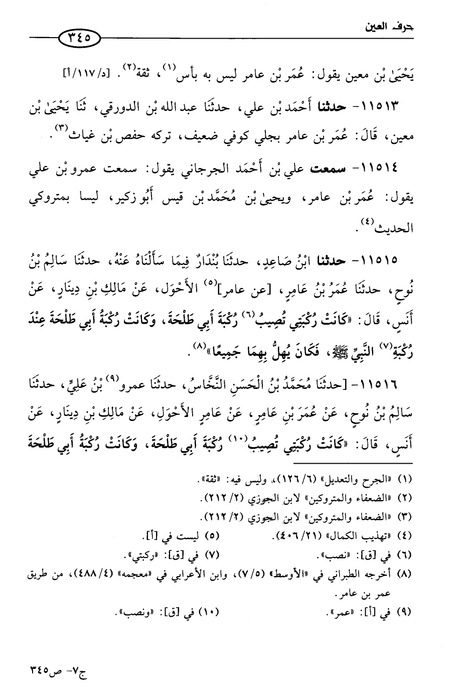 11514 - سمعت علي بن أحمد الجرجاني يقول: سَمعتُ عَمرو بن علي يقول: عُمر بن عامر، ويحيى بن مُحمد بن قيس أَبو زكير، ليسا بمتروكي الحديث.