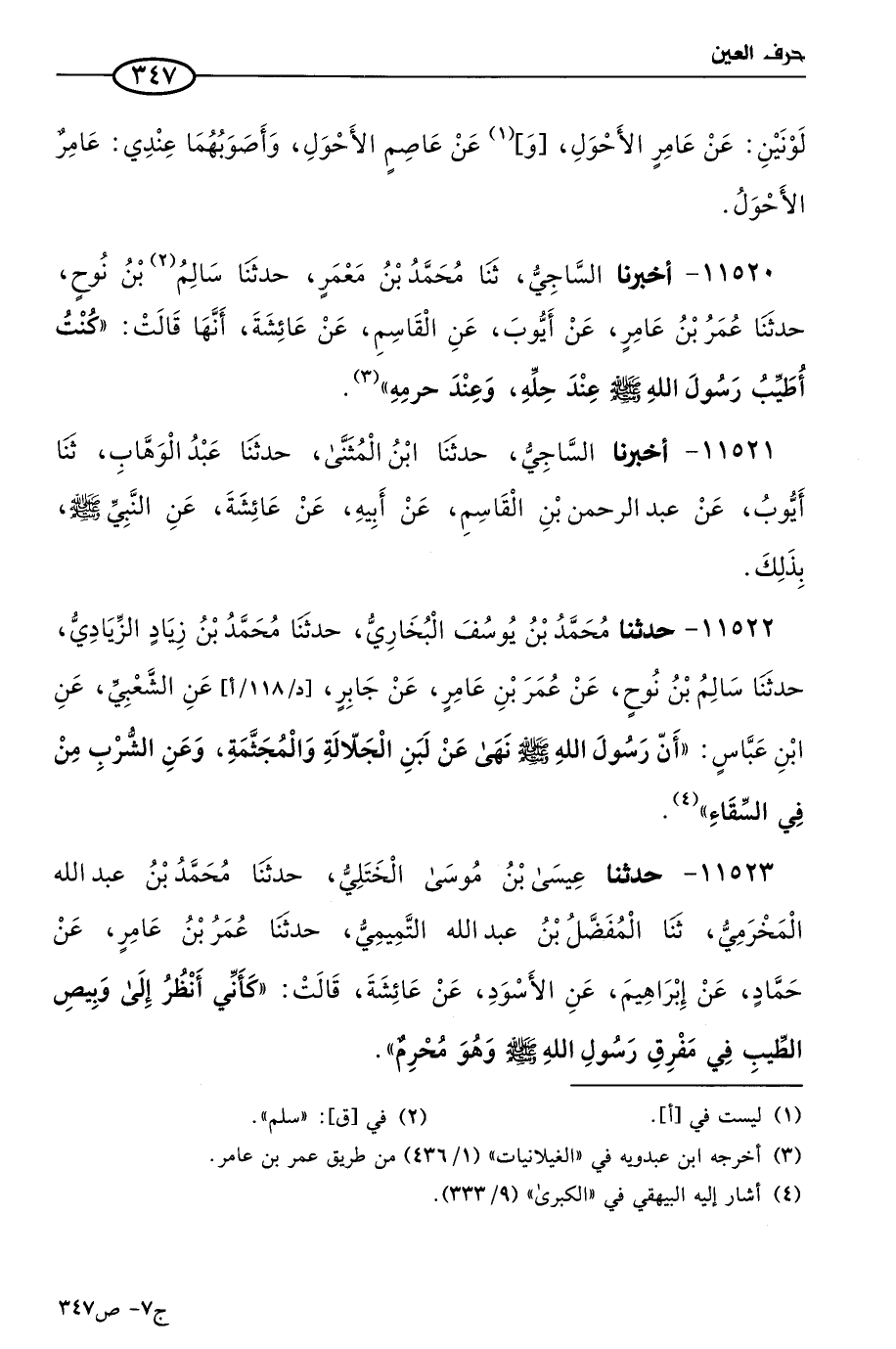 11520 - أخبرنا الساجي، حَدثنا مُحمد بن معمر، حَدثنا سالم بن نوح، حَدثنا عُمر بن عامر، عن أيوب، عن القاسم، عن عائشة، أنها قالت: كنت أطيب رسول الله صَلى الله عَليه وسَلم عند حله، وعند حرمه.