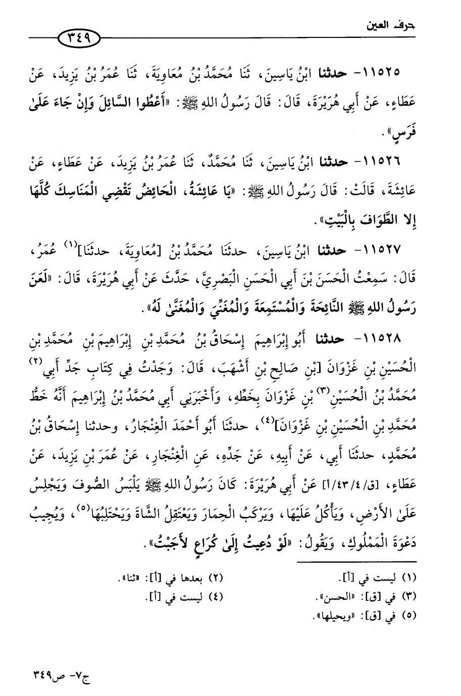 11527 - حَدثنا ابن ياسين، حَدثنا مُحمد بن معاوية، حَدثنا عُمر، قال: سمعتُ الحسن بن أبي الحسن البصري، حَدَّث عن أبي هريرة قال: لعن رسول الله صَلى الله عَليه وسَلم النائحة والمستمعة، والمغني والمغنى له.