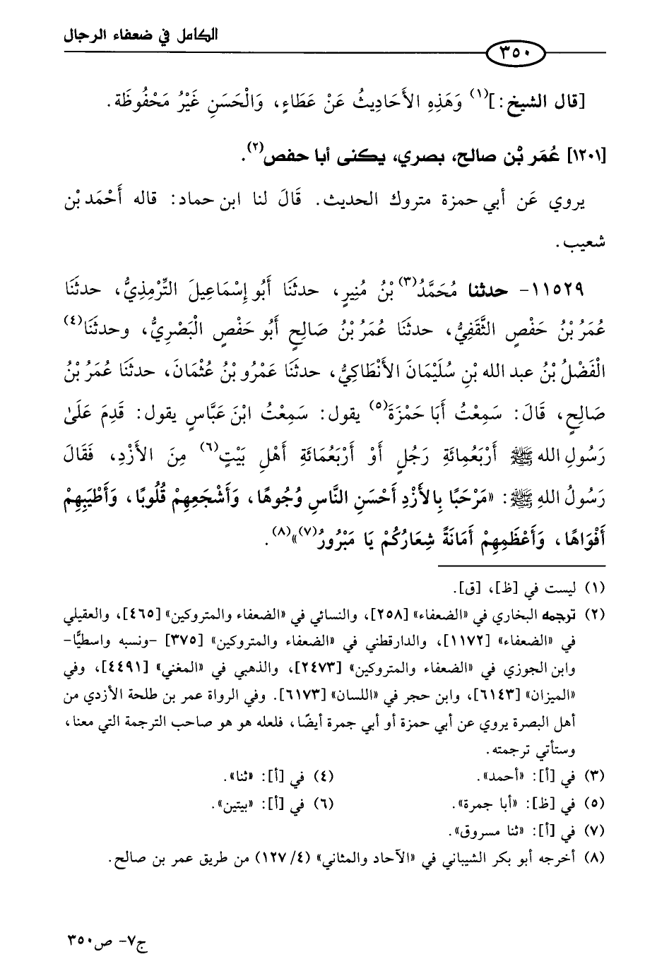11529 - حَدثنا مُحمد بن منير، حَدثنا أَبو إسماعيل الترمذي، حَدثنا عُمر بن حفص الثقفي، حَدثنا عُمر بن صالح أَبو حفص البصري (ح) وحَدثنا الفضل بن عَبد الله بن سليمان الأنطاكي، حَدثنا عَمرو بن عثمان، حَدثنا عُمر بن صالح، قال: سمعتُ أبا جَمرَة (1) يقول: سَمعتُ ابن عباس، يقول: قدم على رسول الله صَلى الله عَليه وسَلم أربعمِائَة رجل، أو أربعمِائَة أهل بيت من الأزد، فقال رسول الله صَلى الله عَليه وسَلم: مرحبا بالأزد، أحسن الناس وجوها، وأشجعهم قلوبا، وأطيبهم أفواها، وأعظمهم أمانة، شعاركم: يا مبرور.