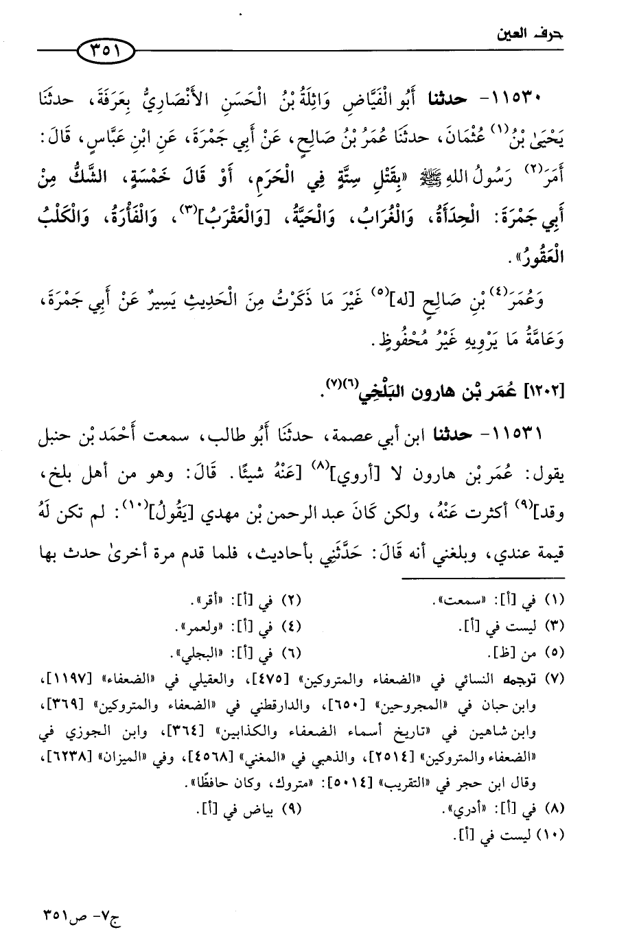 11530 - حَدثنا أَبو الفياض واثلة بن الحسن الأنصاري بعرفة، حَدثنا يَحيى بن عثمان، حَدثنا عُمر بن صالح، عن أبي جَمرَة، عن ابن عباس قال: أمر رسول الله صَلى الله عَليه وسَلم بقتل ستة في الحرم، أو قال خمسة، الشك من أبي جَمرَة: الحدأة، والغراب، والحية، والعقرب، والفأرة، والكلب العقور.