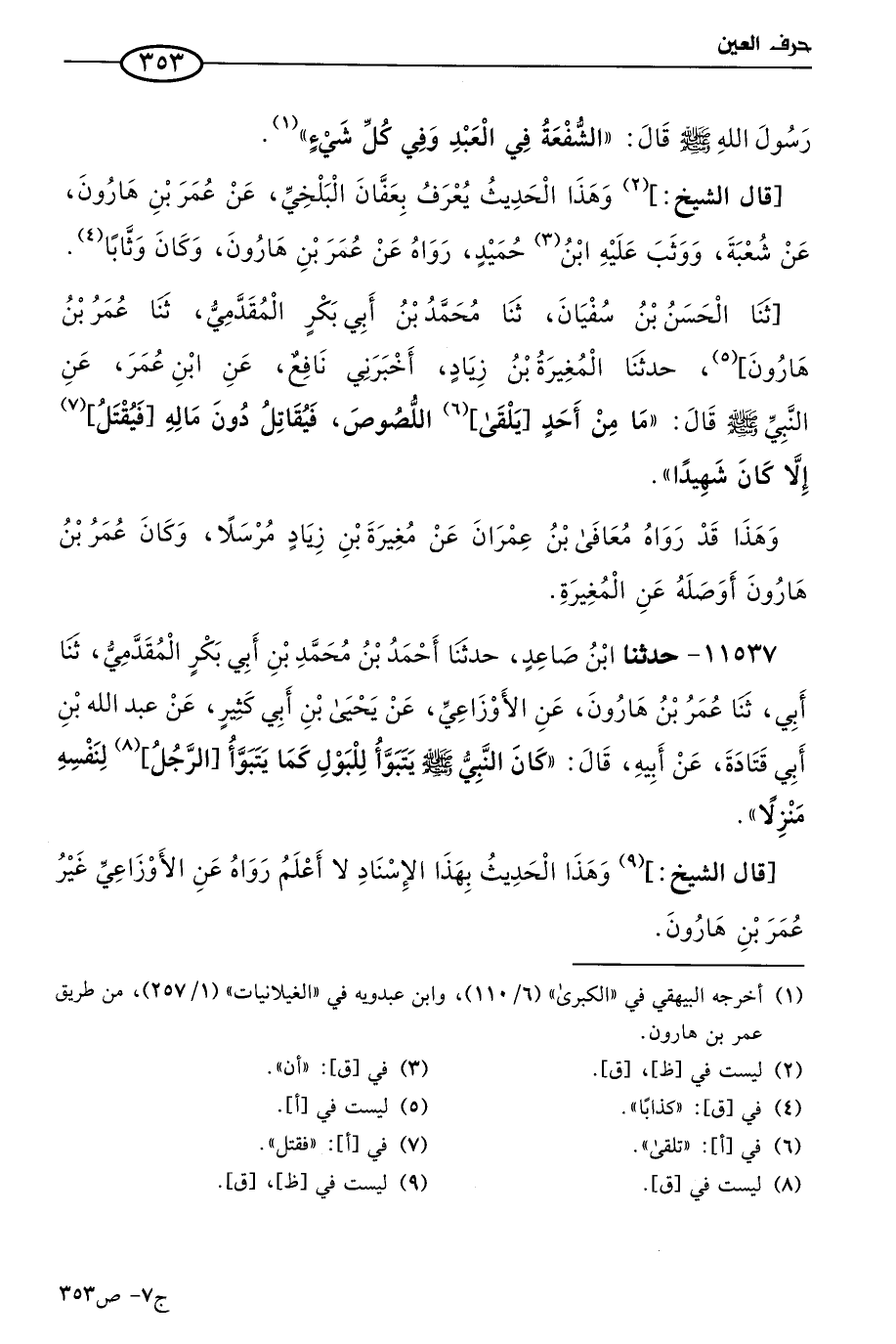 حَدثنا الحسن بن سفيان، حَدثنا مُحمد بن أبي بكر المقدمي، حَدثنا عُمر بن هارون، حَدثنا المغيرة بن زياد، أخبرني نافع، عن ابن عُمر، عن النبي صَلى الله عَليه وسَلم قال: ما من أحد يلقى اللصوص فيقاتل دون ماله فيقتل، إلا كان شهيدا.