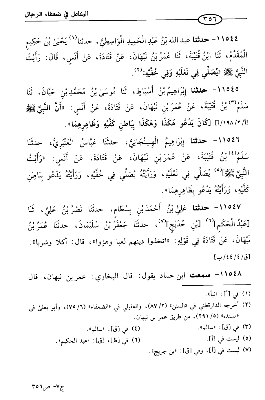 11546 - حَدثنا إبراهيم الهسنجاني، حَدثنا عباس العنبري، حَدثنا سلم بن قتيبة، عن عُمر بن نبهان، عن قَتادَة، عن أَنَس، رأيت النبي صَلى الله عَليه وسلم يصلي في نعليه، ورأيته يصلي في خفيه، ورأيته يدعو بباطن كفيه، ورأيته يدعو بظاهرهما.