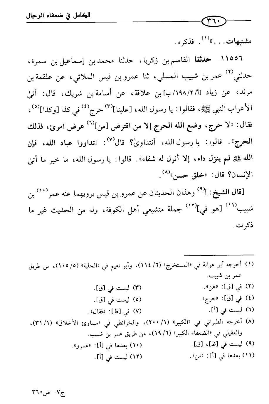 11556 - حَدثنا القاسم بن زكريا، حَدثنا مُحمد بن إسماعيل بن سمرة، حَدَّثني عُمر بن شبيب المسلي، حَدثنا عَمرو بن قيس الملائي، عن علقمة بن مرثد، عن زياد بن علاقة، عن أسامة بن شَريك قال: أتى الأعراب النبي صَلى الله عَليه وسلم فقالوا: يا رسول الله، علينا حرج في كذا وكذا؟ فقال: لا حرج، وضع الله الحرج، إلا من اقترض من عرض امرئ، فذلك الحرج، قالوا: يا رسول الله، أنتداوى؟ قال: تداووا عباد الله، فإن الله عَزّ وجَلّ لم ينزل داء إلا أنزل له شفاء، قالوا: يا رسول الله، ما خير ما أتى الإنسان؟ قال: خلق حسن.