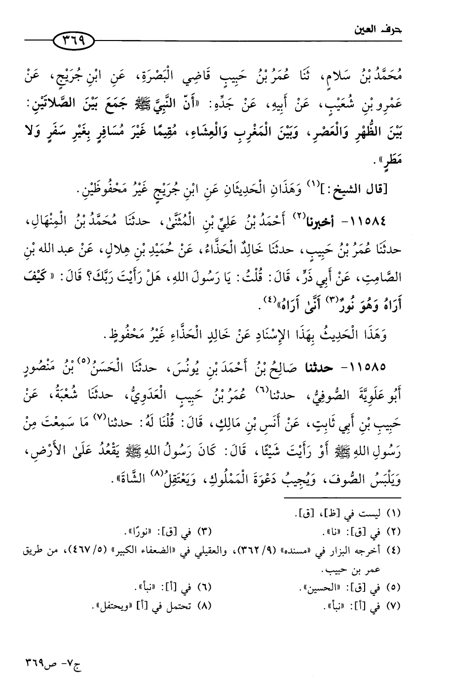 11584 - أخبرنا أحمد بن علي بن المثنى، حَدثنا مُحمد بن المنهال، حَدثنا عُمر بن حبيب، حَدثنا خالد الحذاء، عن حميد بن هلال، عن عَبد الله بن الصامت، عن أَبِي ذَرٍّ، قال: قلتُ: يا رسول الله، هل رأيت ربك؟ قال: كيف أراه، وهو نور أَنَّى أراه.