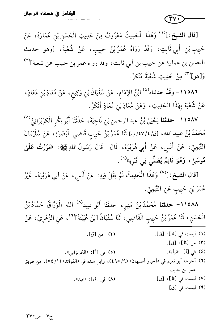 11587 - حَدثنا يَحيى بن عَبد الرحمن بن ناجية، حَدثنا أَبو بكر الكزبراني مُحمد بن عُبيد الله، حَدثنا عُمر بن حبيب قاضي البصرة، عن سليمان التيمي، عن أَنَس، عن أبي هريرة، قال: قال رسول الله صَلى الله عَليه وسَلم: مررت على موسى وهو قائم يصلي في قبره.