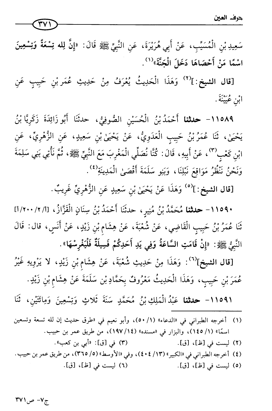 11589 - حَدثنا أحمد بن الحسين الصُّوفي، حَدثنا أَبو زائدة زكريا بن يَحيى، حَدثنا عُمر بن حبيب العدوي، عن يَحيى بن سعيد، عن الزُّهْري، عن ابن كعب، عن أبيه قال: كُنا نصلي المغرب مع النبي صَلى الله عَليه وسلم، ثم نأتي بني سلمة ونحن ننظر مواقع نبلنا، وبنو سلمة أقصى المدينة.