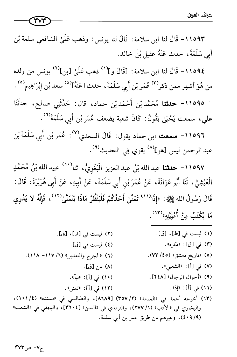 11596 - سمعتُ ابن حماد يقول: قال السعدي: عُمر بن أبي سلمة بن عَبد الرحمن ليس بقوي في الحديث.