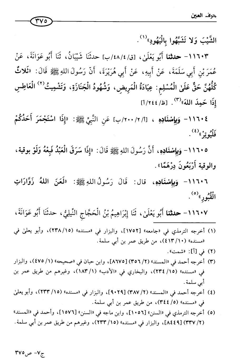 11603 - حَدثنا أَبو يَعلَى، حَدثنا شيبان، حَدثنا أَبو عَوَانة، عن عُمر بن أبي سلمة، عن أبيه، عن أبي هريرة؛ أن رسول الله صَلى الله عَليه وسَلم قال: ثلاث كلهن حق على المسلم: عيادة المريض، وشهود الجنازة، وتشميت العاطس إذا حمد الله.