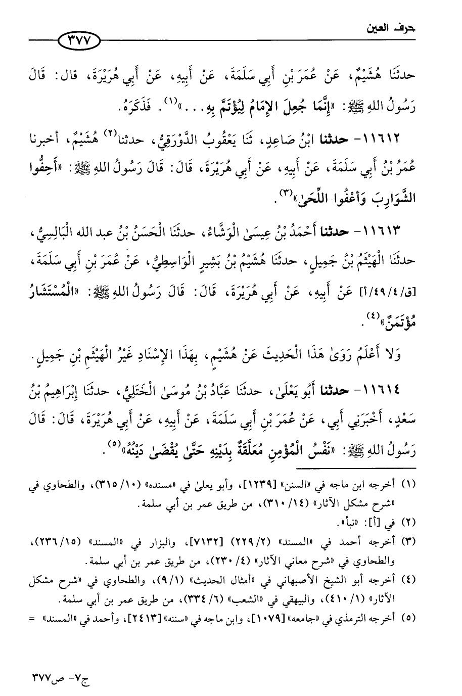 11612 - حَدثنا ابن صاعد، حَدثنا يعقوب الدورقي، حَدثنا هشيم، أخبرنا عُمر بن أبي سلمة، عن أبيه، عن أبي هريرة، قال: قال رسول الله صَلى الله عَليه وسَلم: أحفوا الشوارب، وأعفوا اللحى.