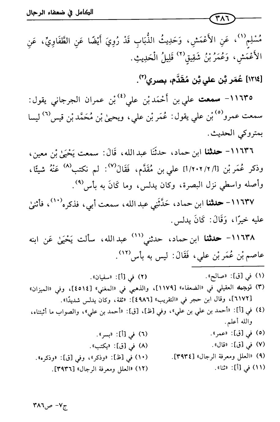 11636 - حَدثنا ابن حماد، حَدثنا عَبد الله، قال: سمعتُ يَحيى بن مَعين، وذكر عُمر بن علي بن مقدم، فقال: لم نكتب عنه شيئا، وأصله واسطي نزل البصرة، وكان يدلس، وما كان به بأس.