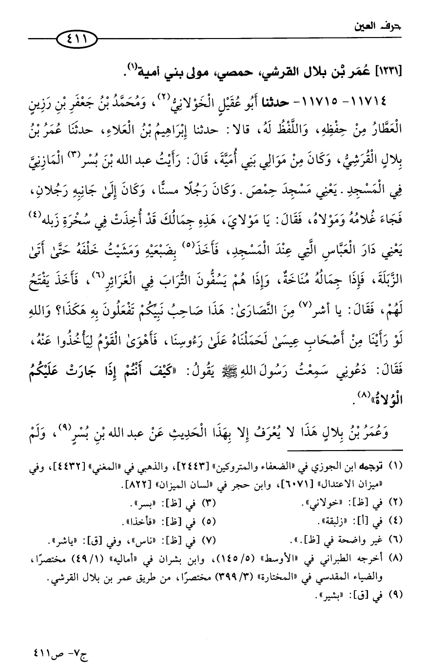 11714 - 11715 - حَدثنا أَبو عقيل الخولاني، ومُحمد بن جعفر بن رزين العطار من حفظه، واللفظ له، قالا: حَدثنا إبراهيم بن العلاء، حَدثنا عُمر بن بلال القرشي، وكان من موالي بني أمية، قال: رأيتُ عَبد الله بن بسر المازني في المسجد، يعني مسجد حمص، وكان رجلاً مسنا، وكان إلى جانبه رجلان، فجاء غلامه ومولاه، فقال: يا مولاي، هذه جمالك قد أُخِذت في سخرة زبلة، يعني دار العباس التي عند المسجد، فأخذا بضبعيه ومشيت خلفه حتى أتى الزبلة، فإذا جماله مناخة، وإذا هم يسفون التراب في الغرائر، فأخذ يفتح لهم، فقال ناس من النصارى (1): هذا صاحب نبيكم تفعلون به هكذا، والله لو رأينا من أصحاب عيسى لحملناه على رءوسنا، فأهوى القوم ليأخذوا عنه، فقال: دعوني، سمعت رسول الله صَلى الله عَليه وسَلم يقول: كيف أنتم إذا جارت عليكم الولاة.