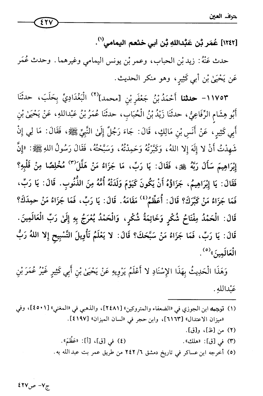11753 - حَدثنا أحمد بن جعفر بن محمد البغدادي بحلب، حَدثنا أَبو هشام الرفاعي، حَدثنا زيد بن الحباب، حَدثنا عُمر بن عَبد الله، عن يَحيى بن أبي كثير، عن أَنَس بن مالك قال: جَاء رجل إلى النبي صَلى الله عَليه وسلم فقال: مالي إن شهدت أن لا إله إلا الله، وكبرته، وحمدته، وسبحته؟ فقال رسول الله صَلى الله عَليه وسَلم: إن إبراهيم سأل ربه عَزّ وجَلَّ، فقال: يا رب، ما جزاء من هلل مخلصا من قلبه؟ فقال: يا إبراهيم، جزاؤه أن يكون كيوم ولدته أمه من الذنوب، قال: يا رب، فما جزاء من كبرك؟ قال: أُعظِمُ مقامه، قال: يا رب، فما جزاء من حمدك؟ قال: الحمد مفتاح شكر، وخاتمة شكر، والحمد يعرج به إلى رب العالمين، قال: يا رب، فما جزاء من سبحك؟ قال: لا يعلم تأويل التسبيح إلا الله رب العالمين.