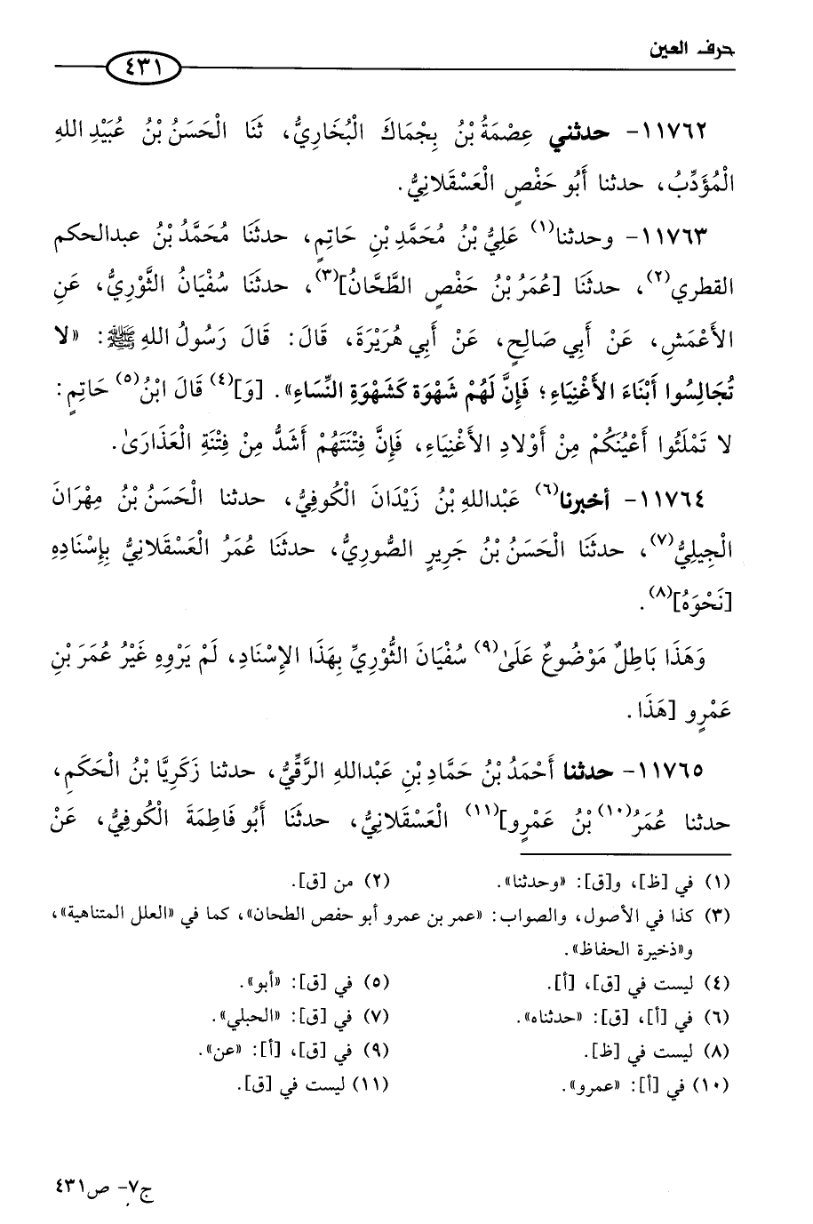 11764 - أخبرنا عَبد الله بن زيدان الكوفي، حَدثنا الحسن بن مهران الجيلي، حَدثنا الحسن بن جرير الصوري، حَدثنا عُمر العسقلاني، بإسنادِه، نَحوه.