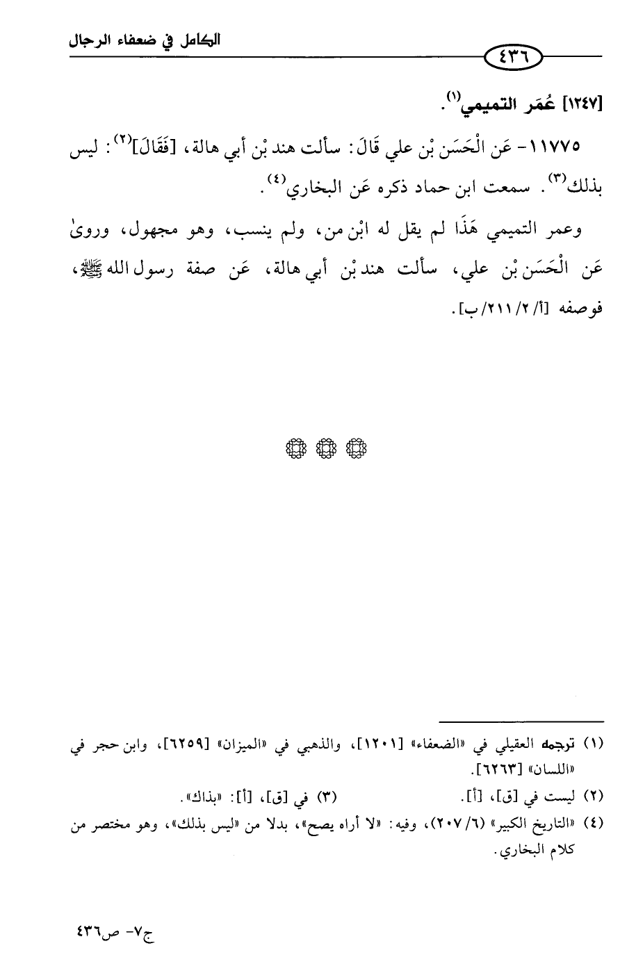 وعمر التميمي هذا لم يقل ابن من، ولم ينسب، وهو مجهول، وروى عن الحسن بن علي؛ سألت هند بن أبي هالة؛ عن صفة رسول الله صَلى الله عَليه وسَلم، فوصفه.